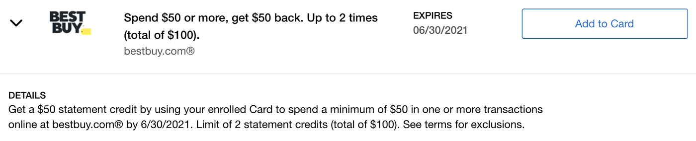 From now through Jan. 31, 2021, cardholders receive a one-time up to $100 statement credit after using your enrolled Amex to spend a minimum of $100.