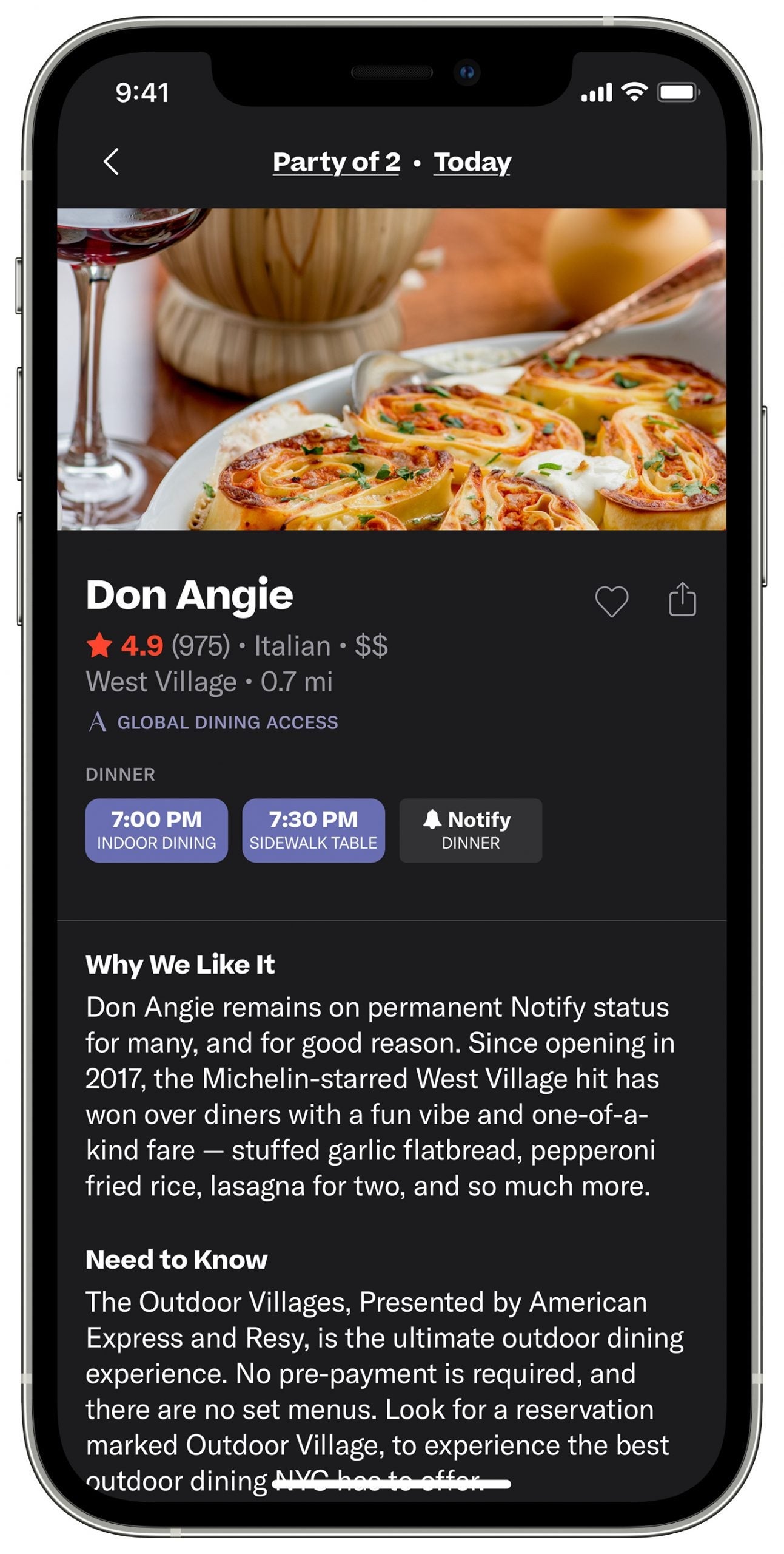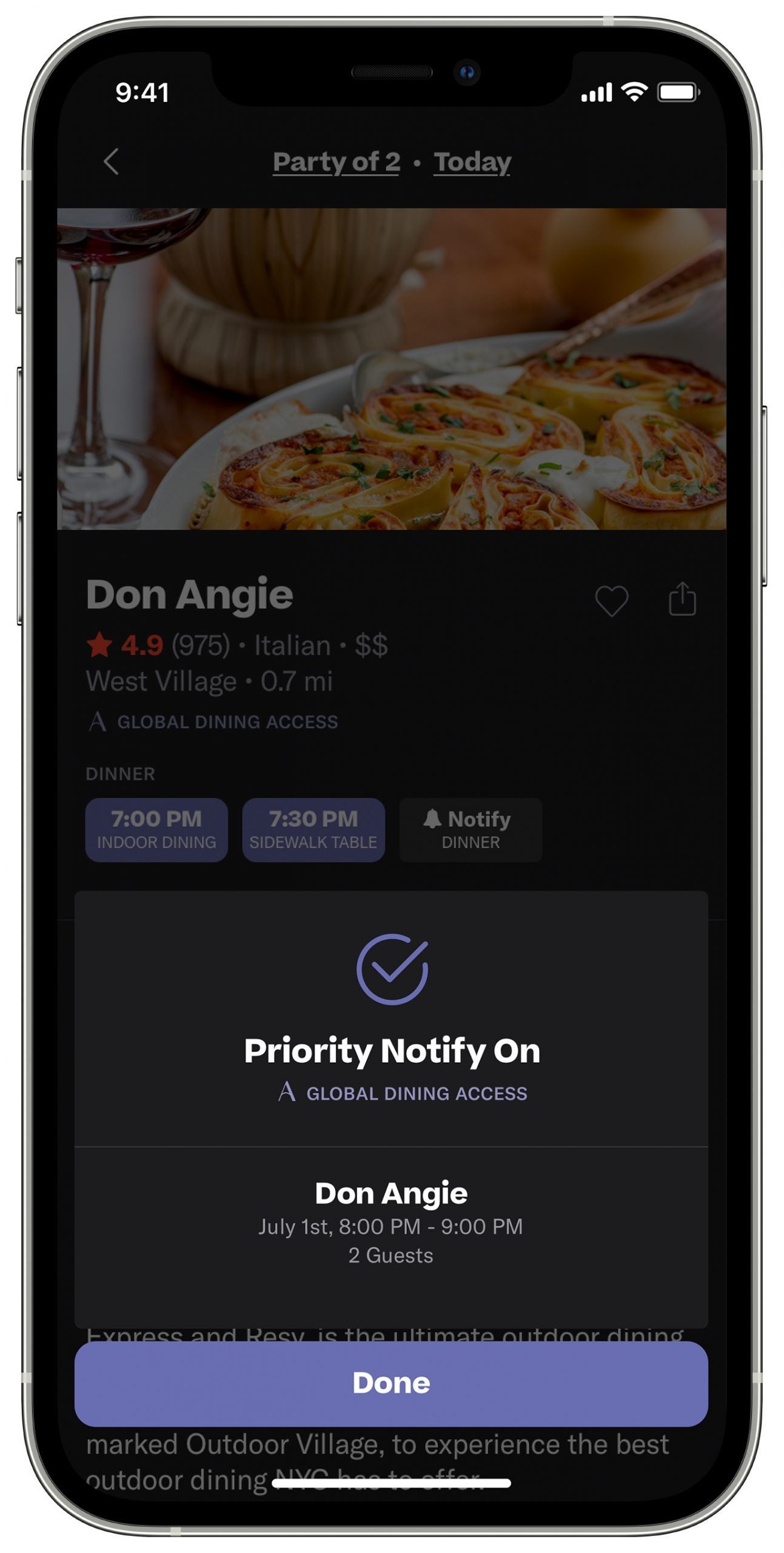Resy is a concierge of sorts -- all in the palm of your hands. In addition to exclusive reservations, Global Dining Access perks include Priority Notify at all Resy's 9,000+ restaurants.