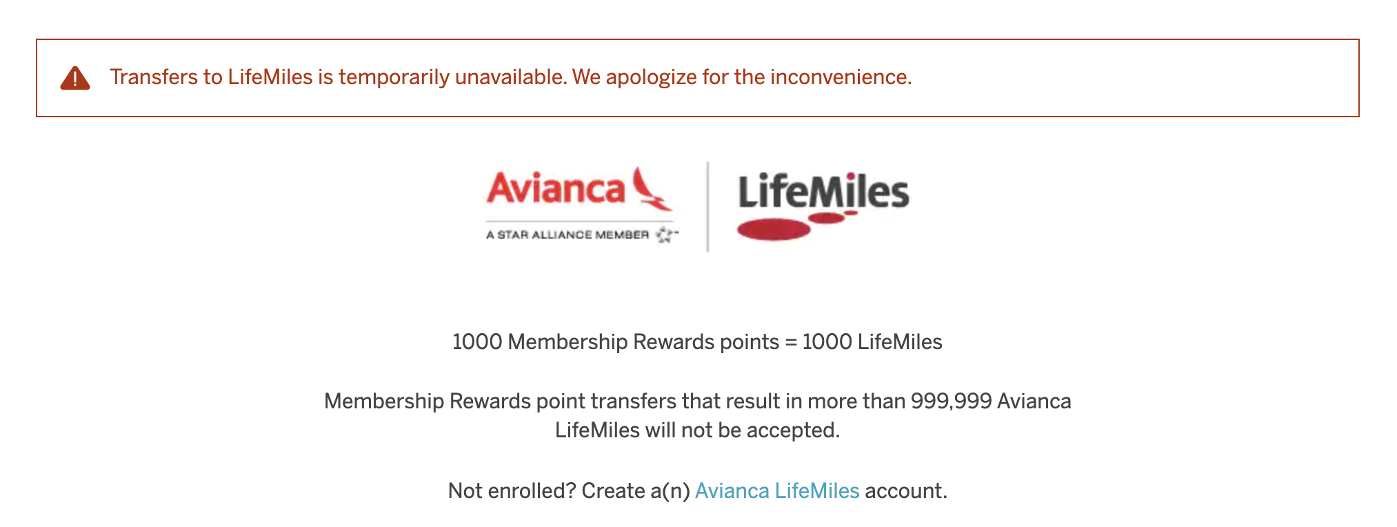 "The Membership Rewards to Avianca points transfer capability is temporarily unavailable due to a technical issue. We are working to get this back up and running soon."
