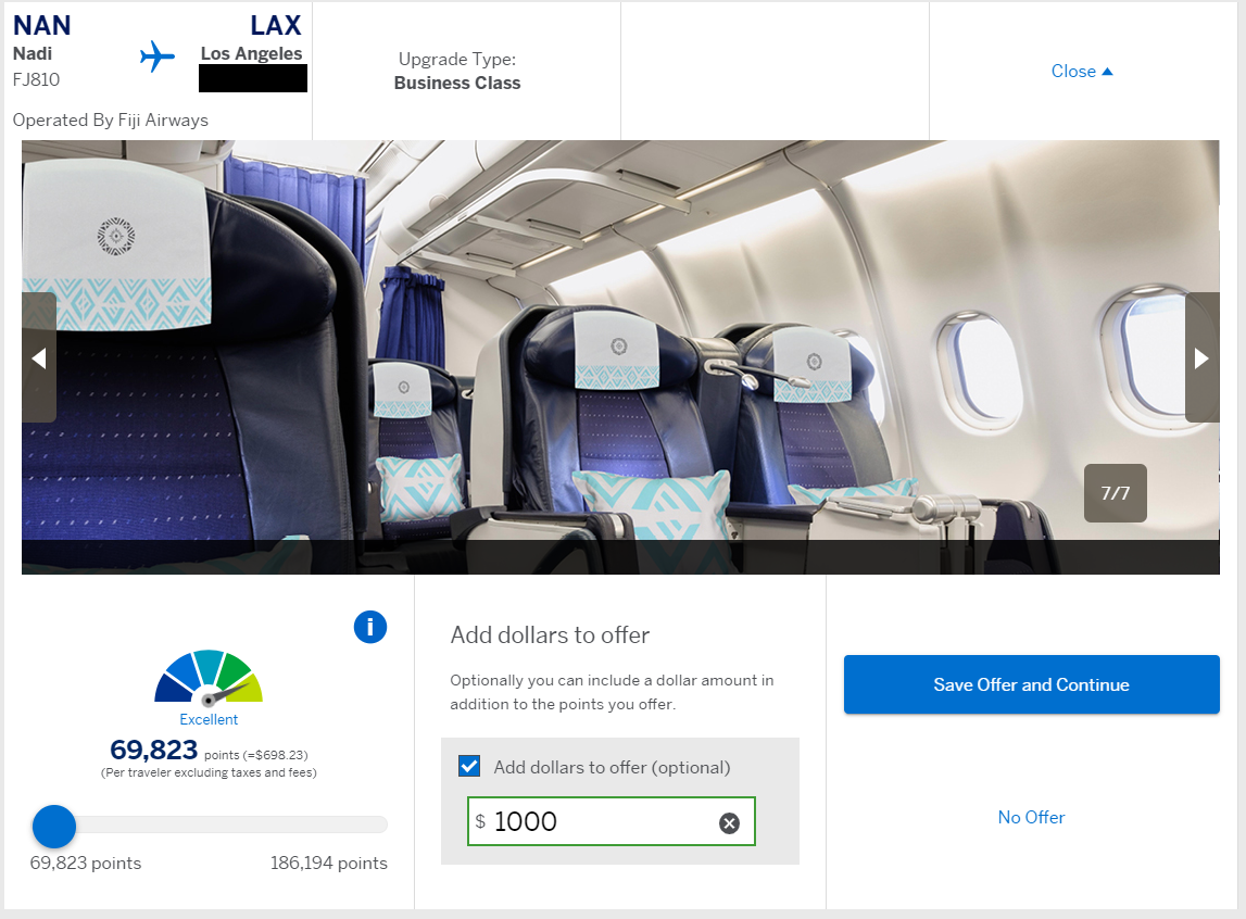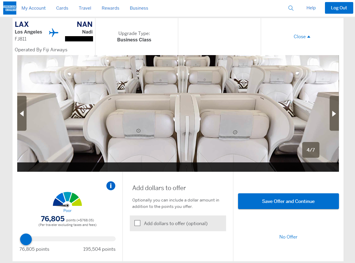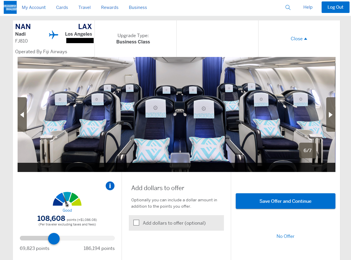 To place the minimum bid for both ways, I'd need to bid at least 146,628 Membership Rewards points— in addition to my economy paid ticket. For reference, if you're able to find Fiji award availability, the round-trip award would cost just 110,000 Alaska miles.