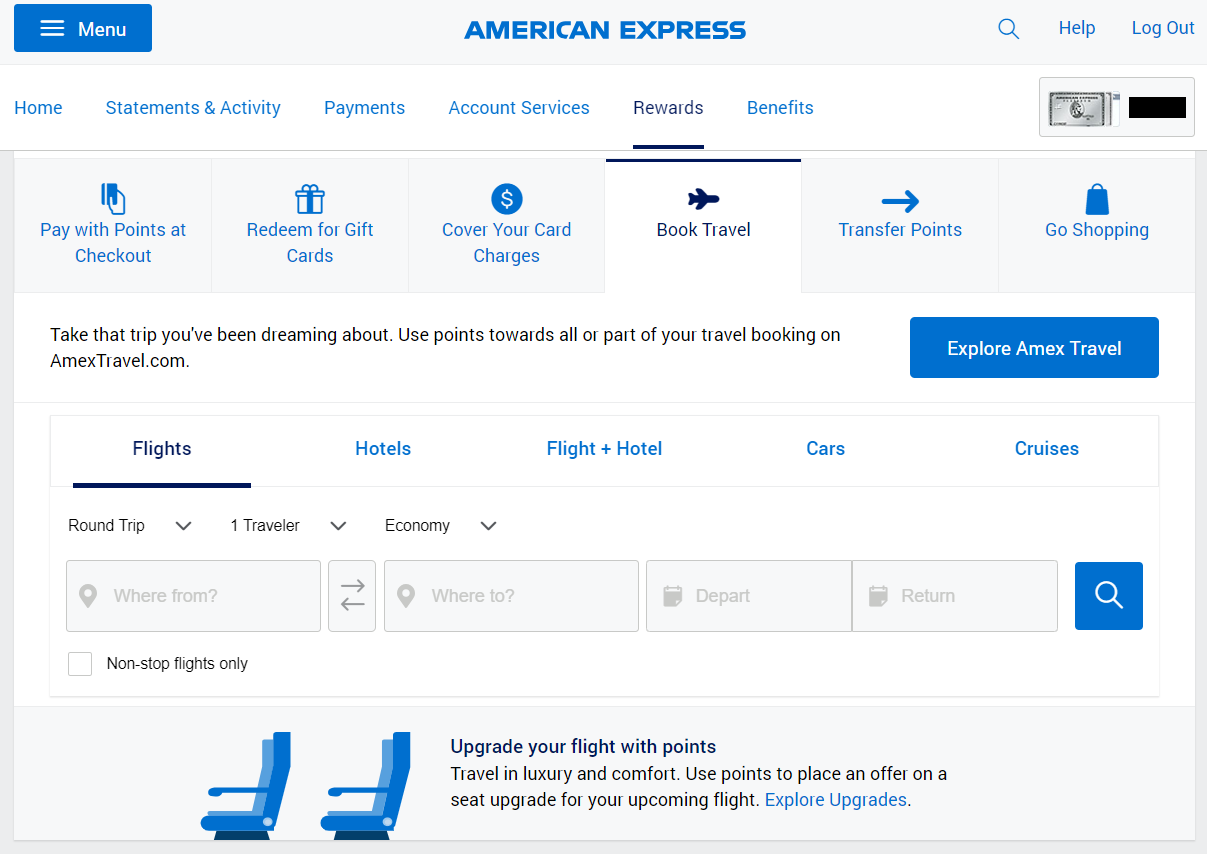 I just so happened to have a cash reservation on one of these airlines, as I took advantage of the incredible $395 round-trip deal from Los Angeles to Fiji that popped up in March. So, we have an opportunity to show how this works. After logging into my account, I went to the "Rewards" tab and scrolled down to "Book Travel." At the bottom of this widget, there's the new option: "Upgrade your flight with points." I clicked "Explore Upgrades" to see my options: