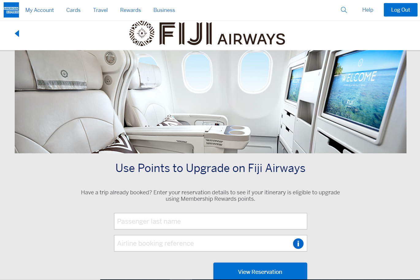Clicking on Fiji Airways brings up a flashy page for me to enter my last name and booking reference number to check my options: