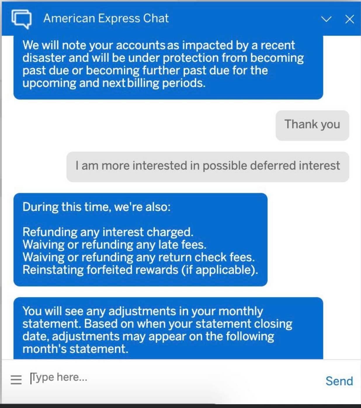 I logged into my own Amex account to try and replicate reader experiences. I asked what criteria would be needed to invoke the financial hardship relief and what all was included. The chat agent requested I provide clarification on how COVID-19 has impacted me. I said I was inquiring for informational purposes and the agent suggested I call the Account Services Department at 1-866703-4169 to have my accounts reviewed for potential relief.