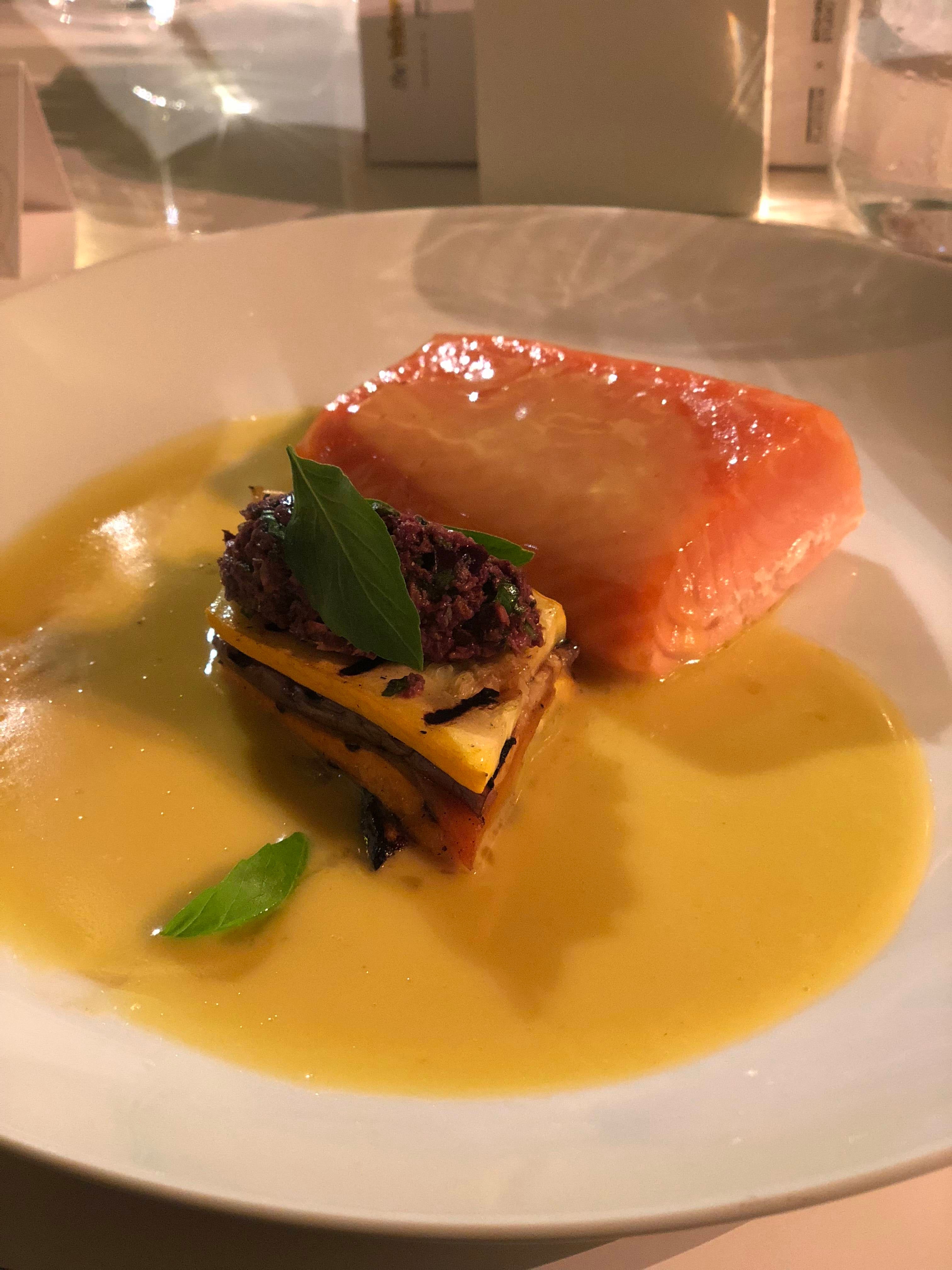 Dinner was an "artistic" multi-course experience, with more cuisine prepared by Chef Dominique Crenn. The food was delicious, especially the salmon. It was devilishly buttery, reminding me of salmon they serve in Iceland. Chef Crenn stayed on theme by incorporating touches of yellow in marigold flowers and yellow saffron sauce in her dishes.