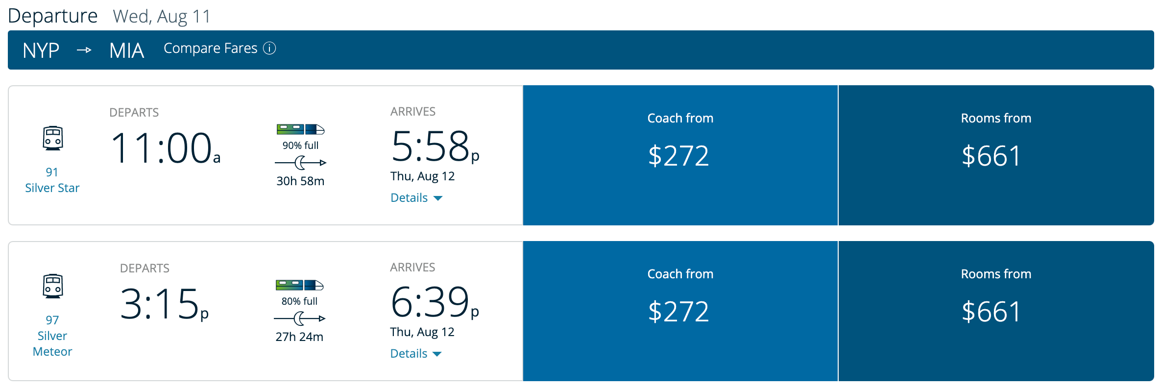 Still, there are plenty of opportunities to score great value, especially with last-minute tickets. Take a train from New York to Miami next week, for example. Paying cash, you'll need to fork over $272 for the one-way trip.