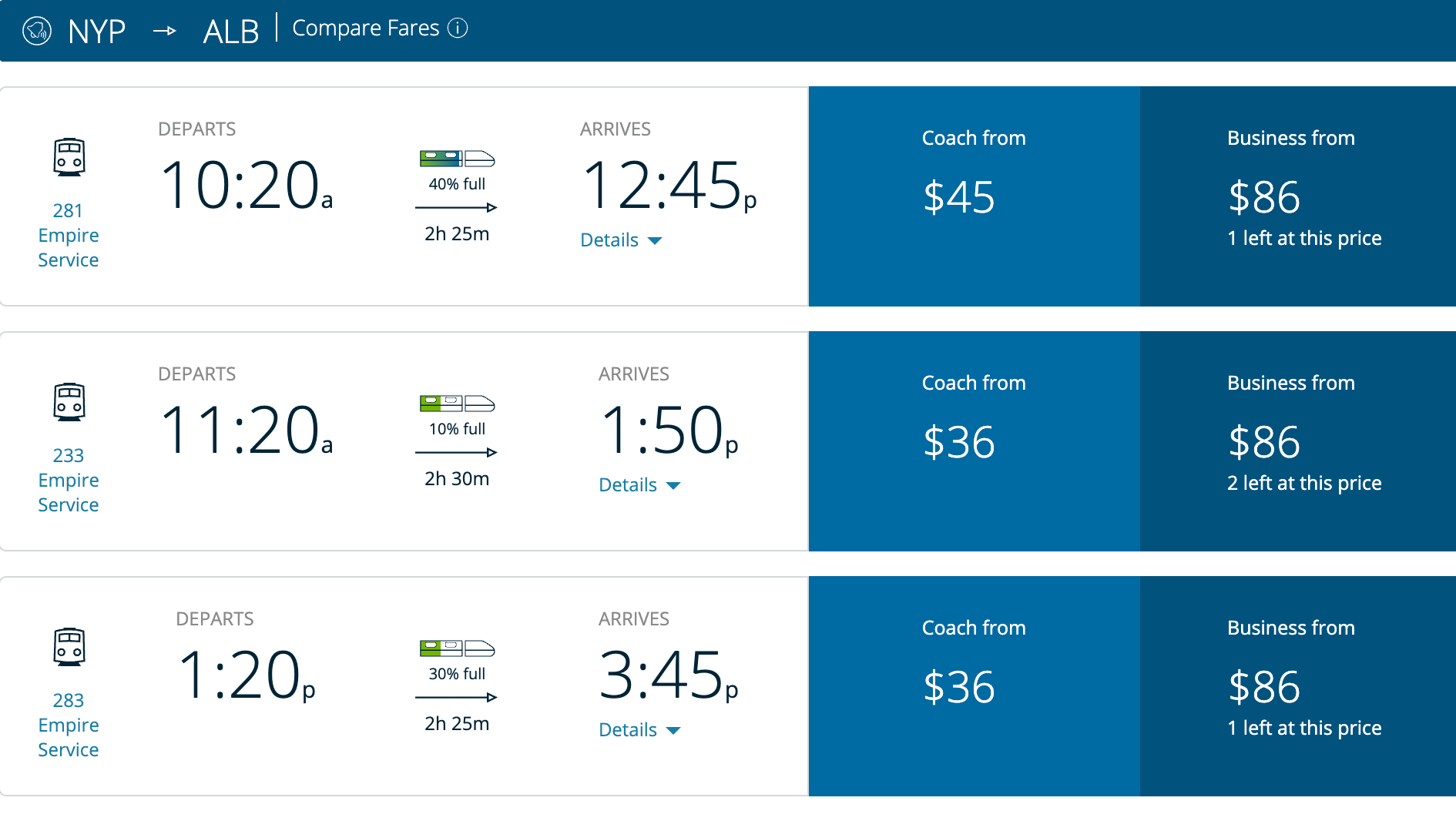 A fare between New York City and Albany can easily run in excess of $100 one-way in normal times, yet my fare was well below that -- even for a Friday morning.