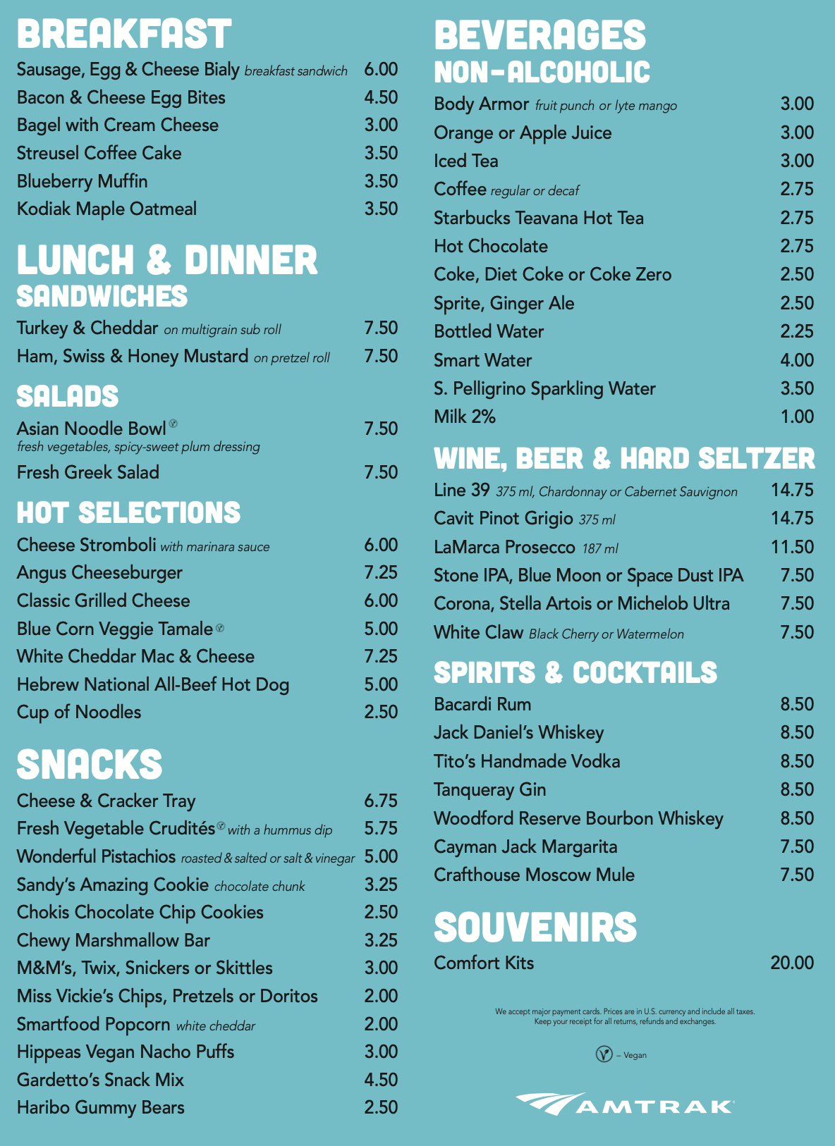Amtrak confirmed prices for the majority of food and beverages on board would remain the same while noting a $.50-$1.50 reduction in the prices of all sandwiches and salads on all Acela and Northeast Regional trains. Breakfast items range from $3.50-$6, while lunch and dinner items are between $5 and $7.50.