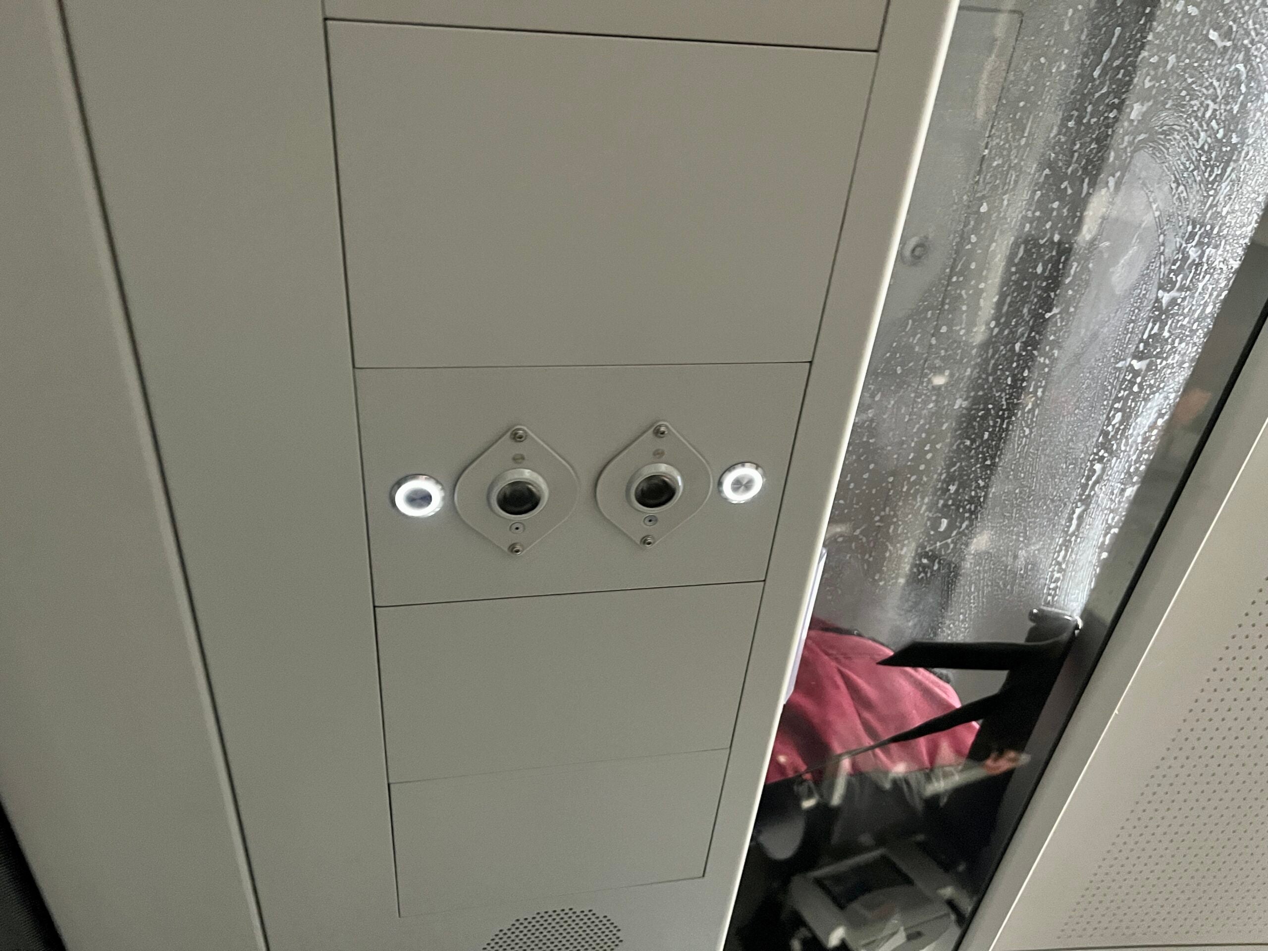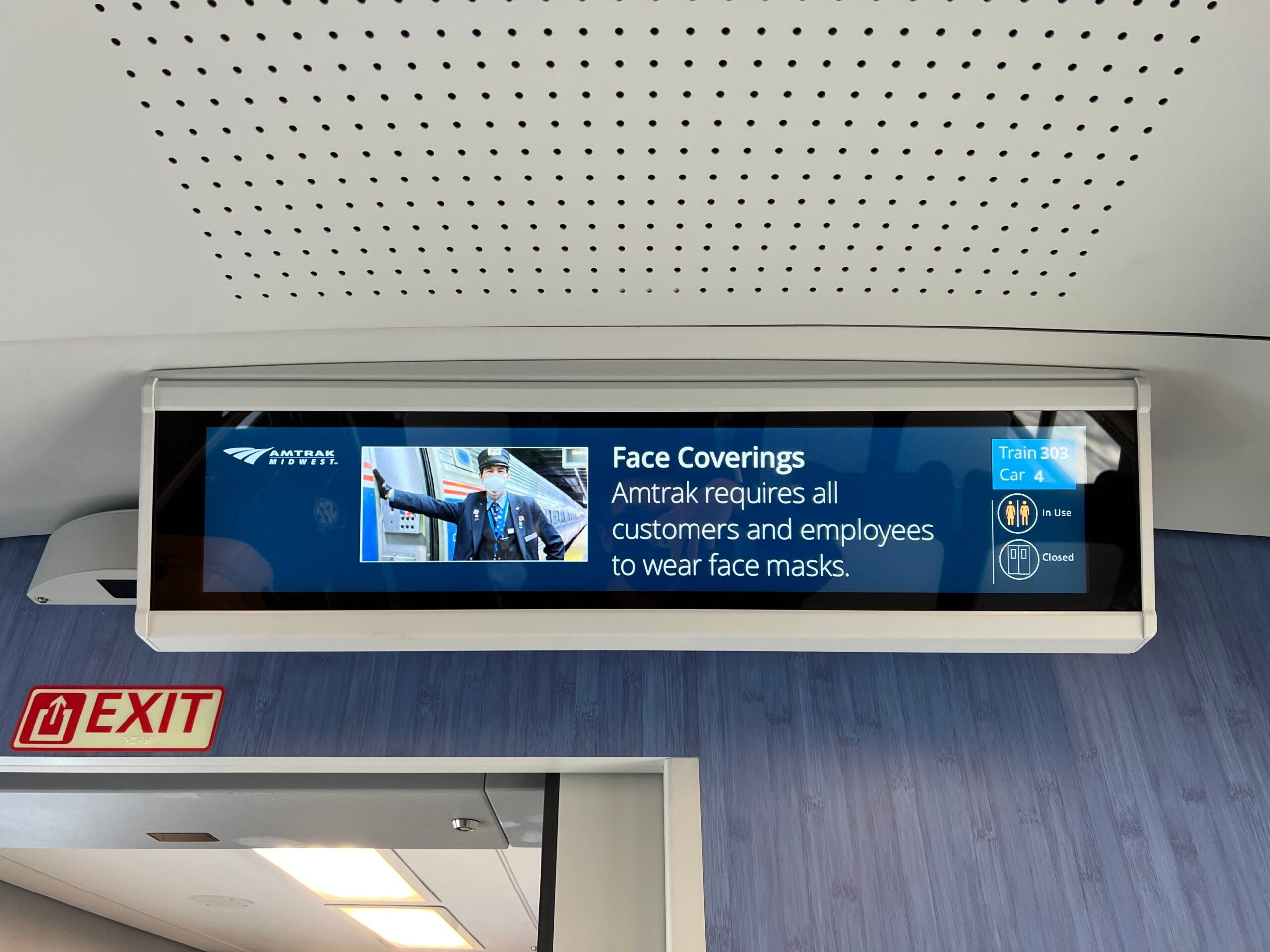 Additionally, large display monitors are located throughout the coach which shows announcements, train information and whether the restroom is in use.