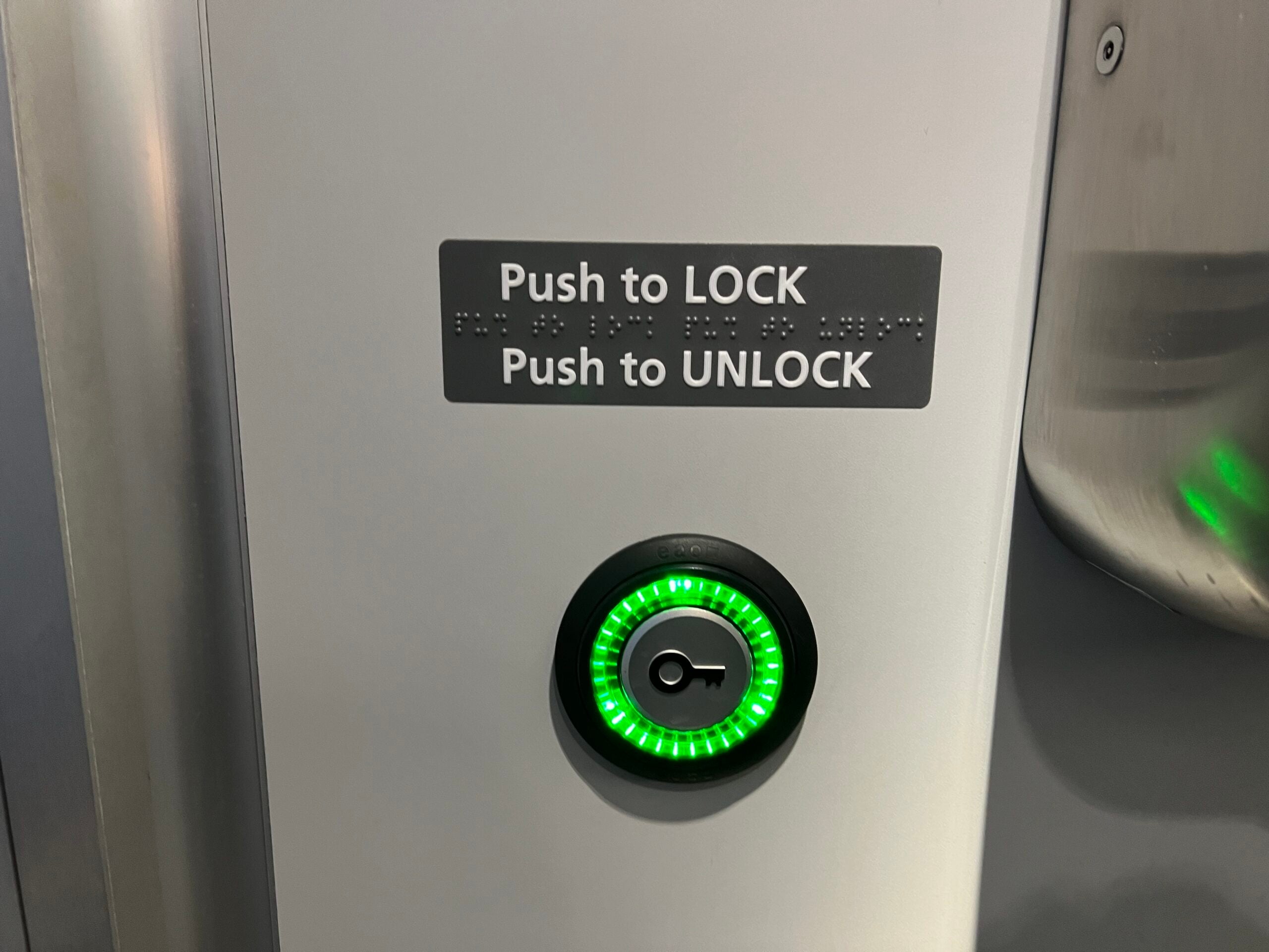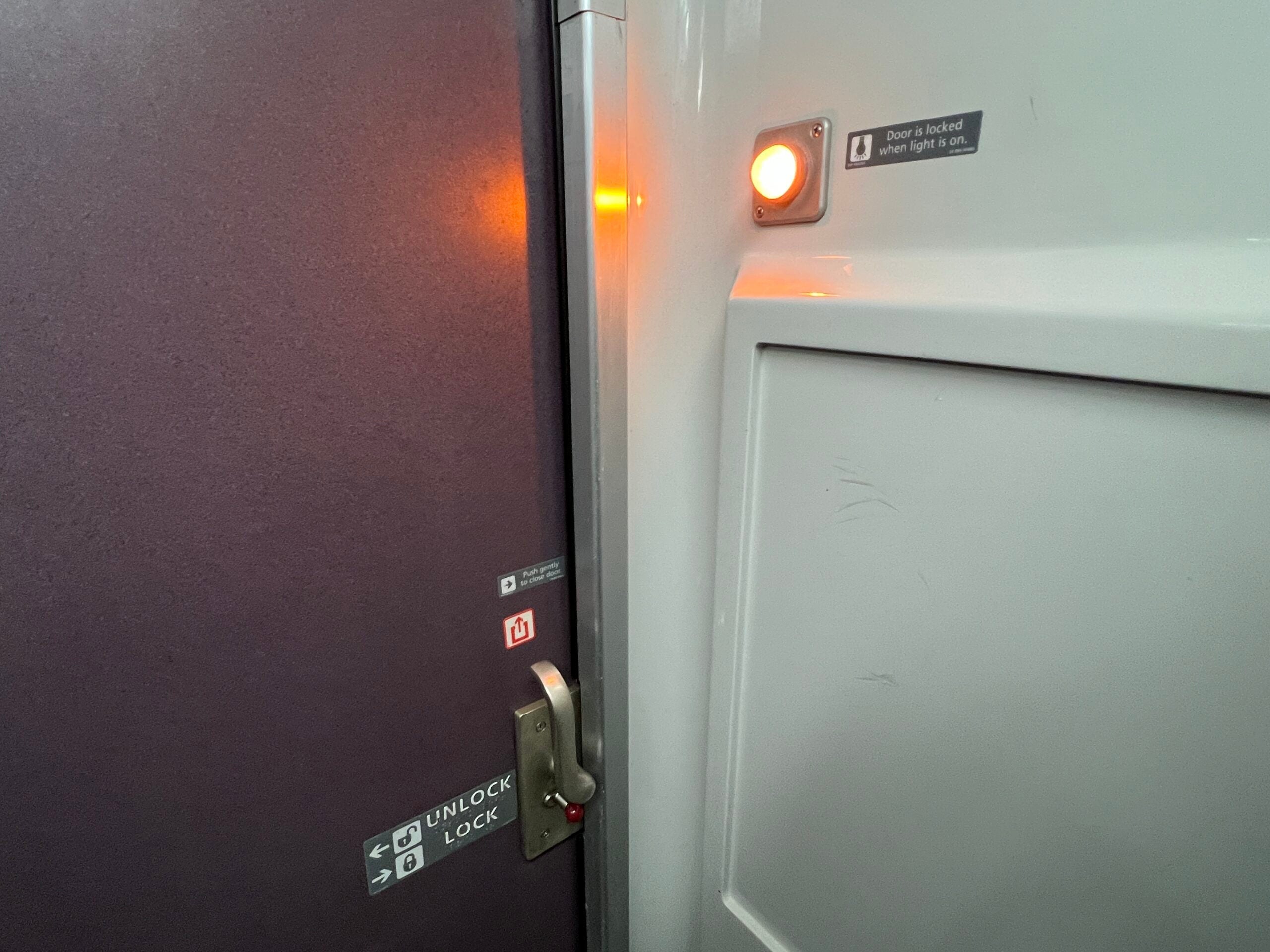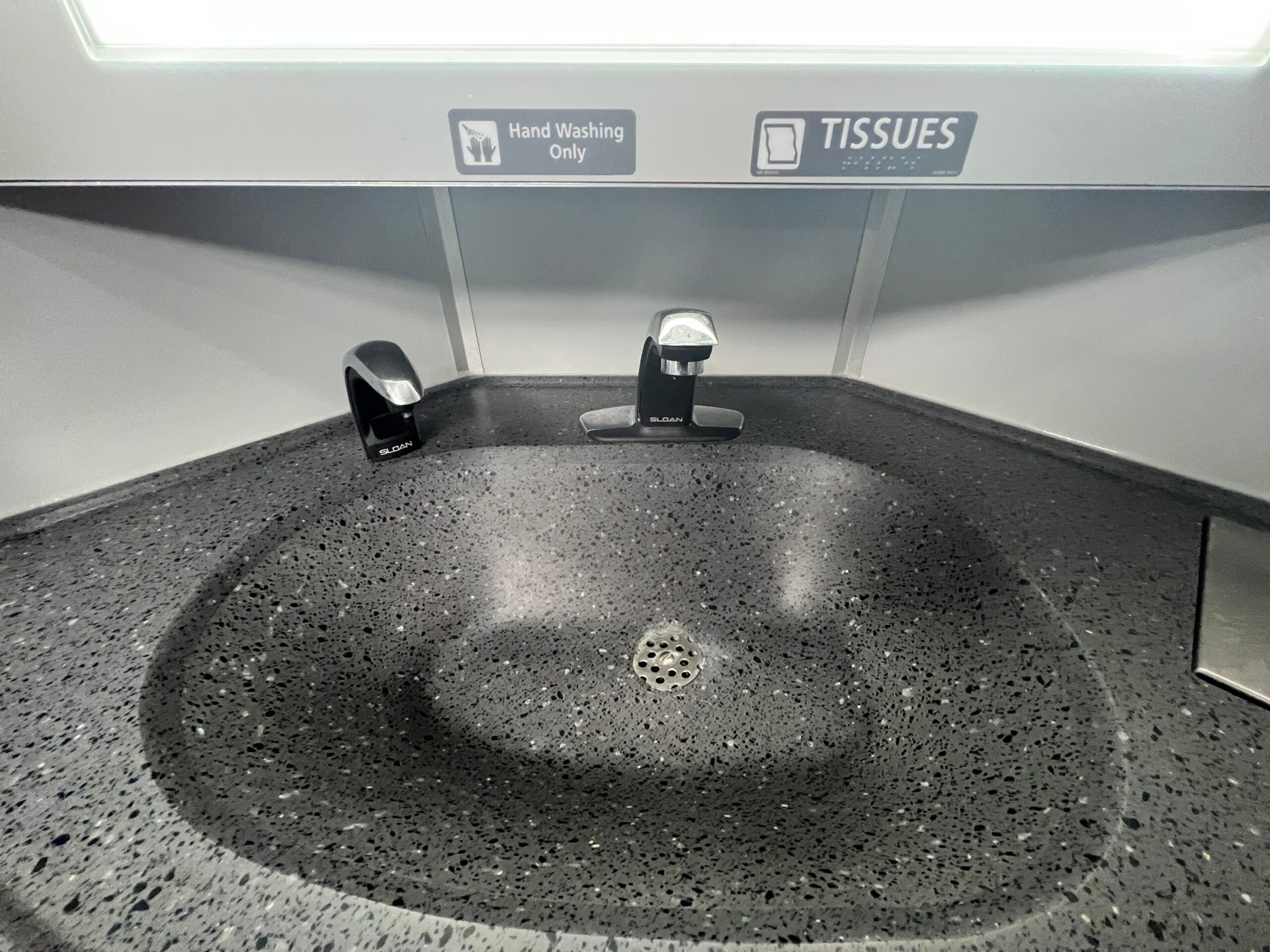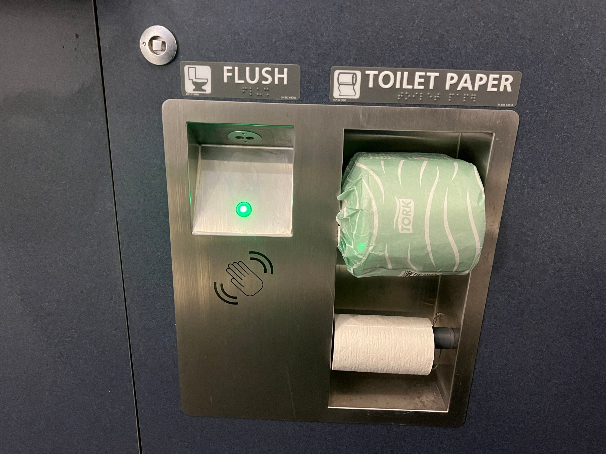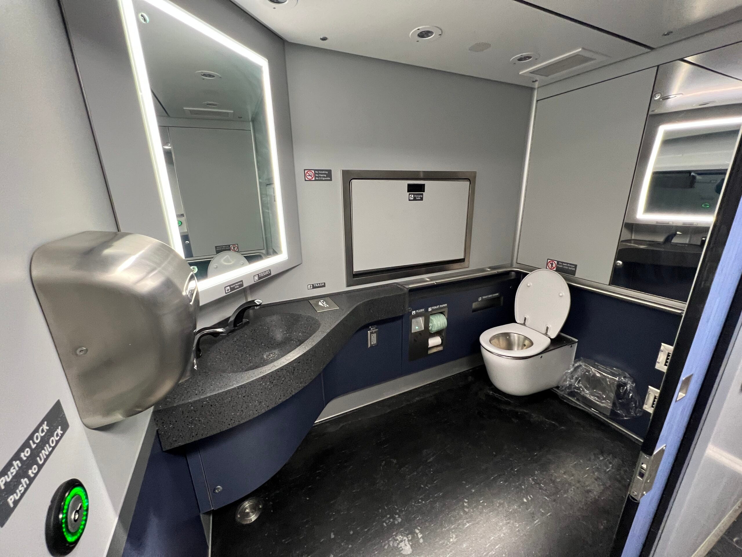 Speaking of which, at the end of each car, you'll find a restroom with new touchless controls. That includes a no-touch faucet, soap dispenser, hand dryer and toilet flushing capabilities.