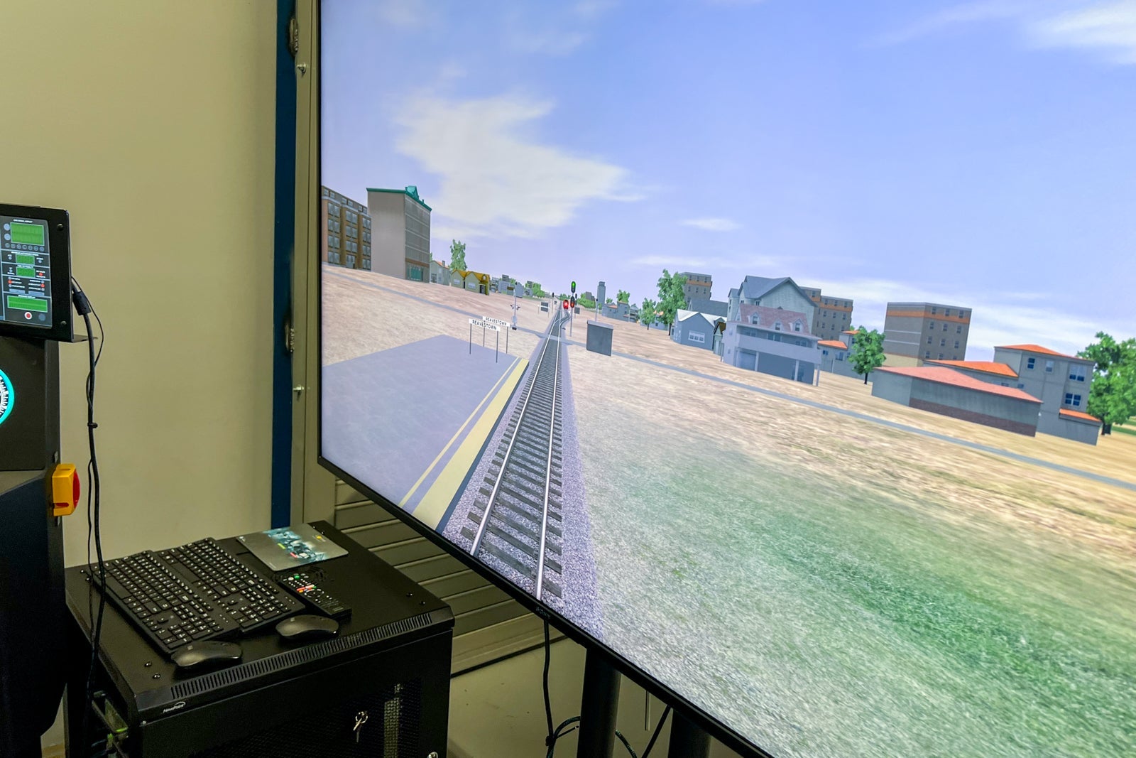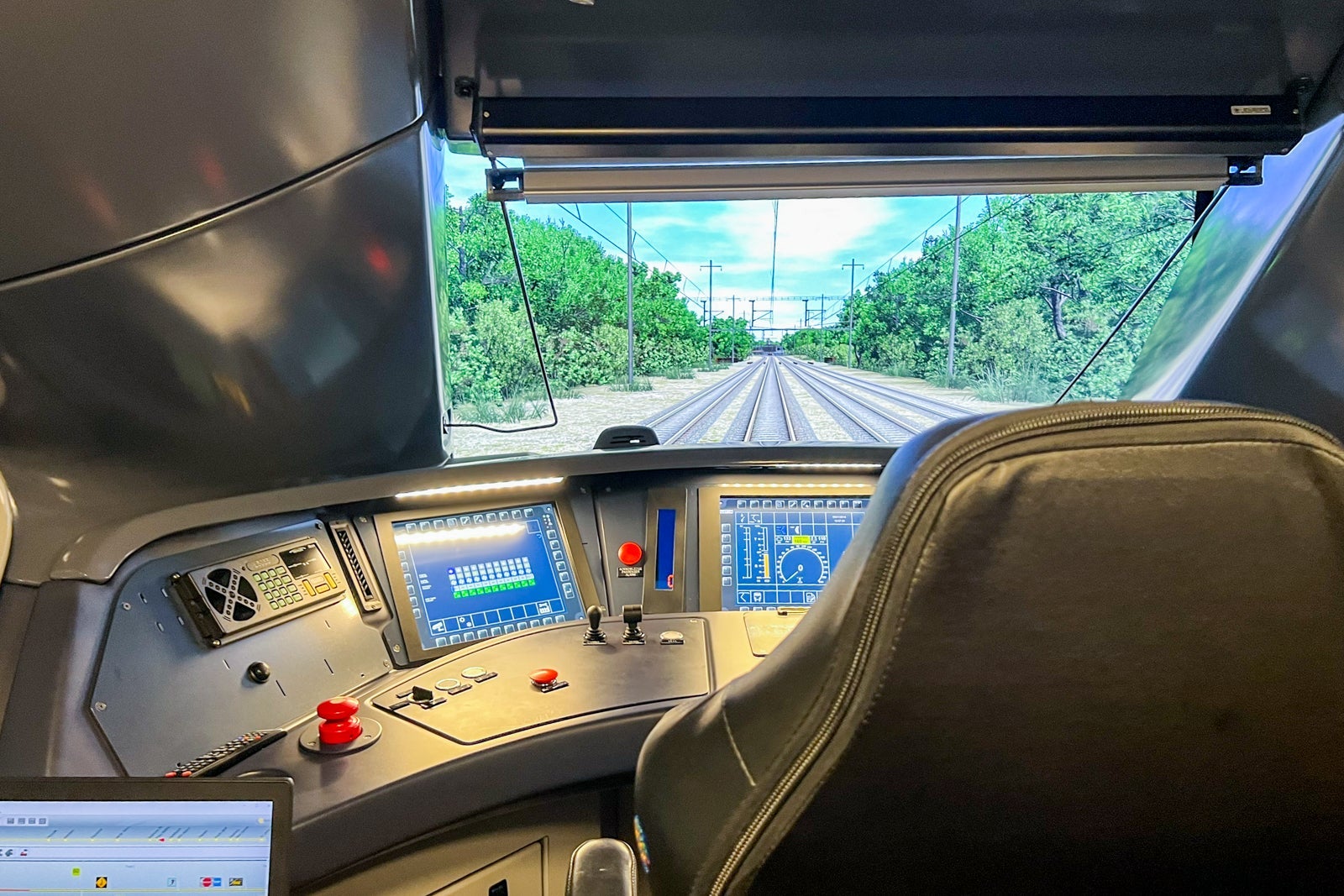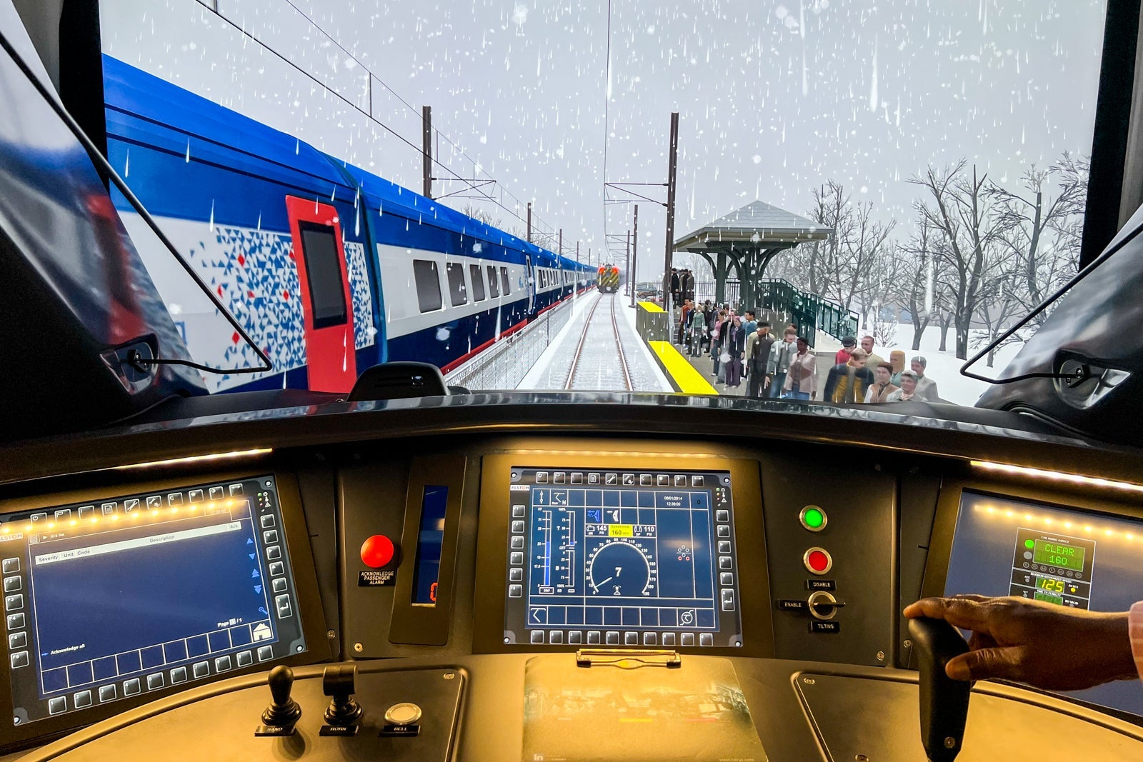 Students interact with virtual reality screens that can re-create nearly any scenario, from rain and snow to stopping at stations and avoiding other trains.