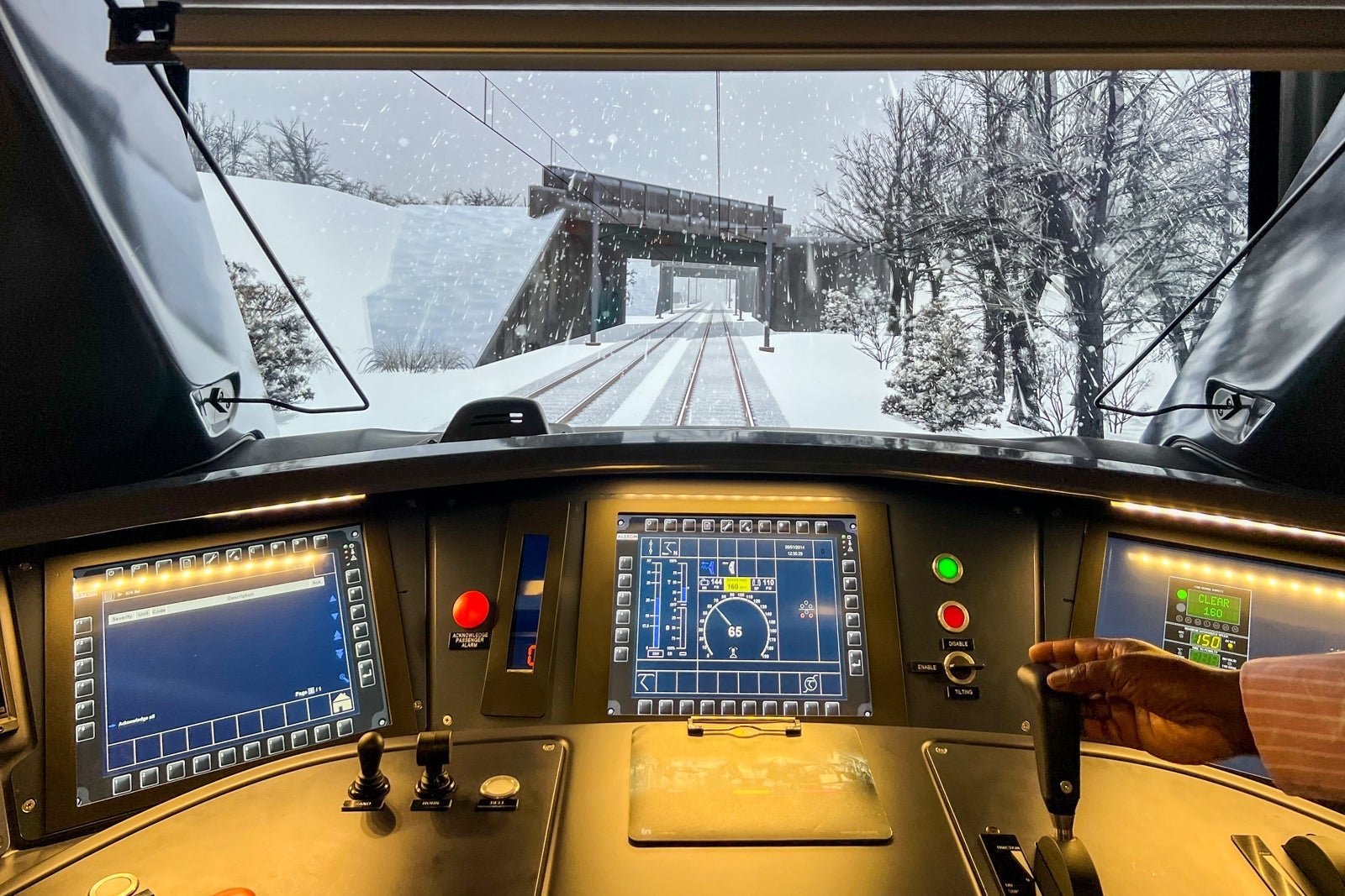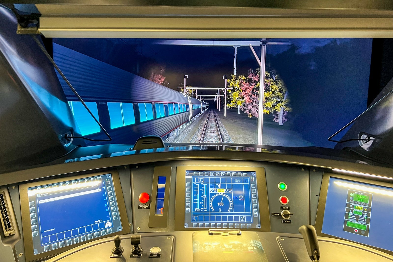 There are several simulators we got to see, but the coolest one by far was the full-scale motion simulator that gives engine drivers (engineers) and conductors a chance to sit in the driver's seat and see what it's like to be in control of one of the fancy new Acela train sets by Alstom.