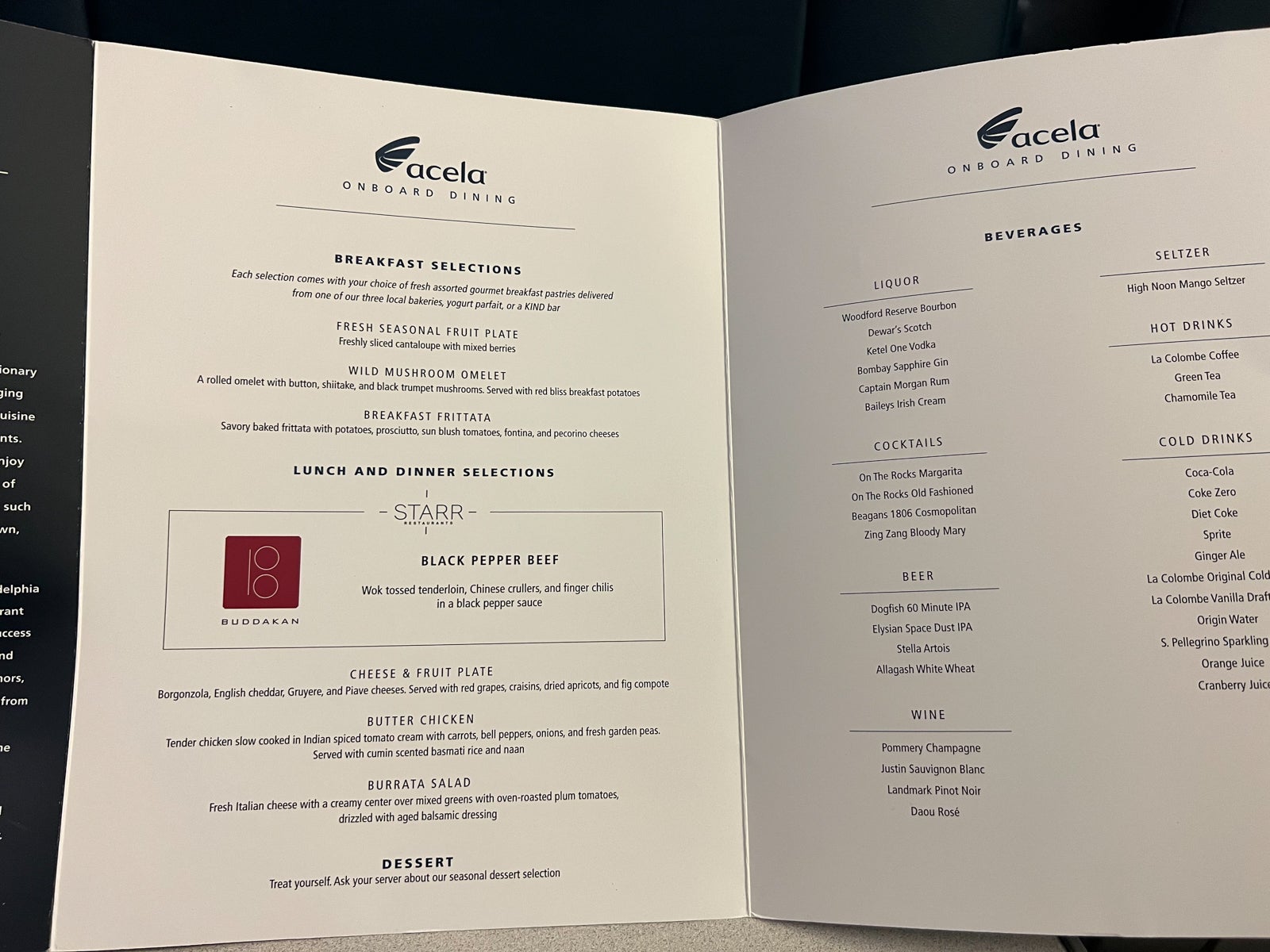 First class on the Acela included a choice of breakfast along with multiple offers of beverage service.