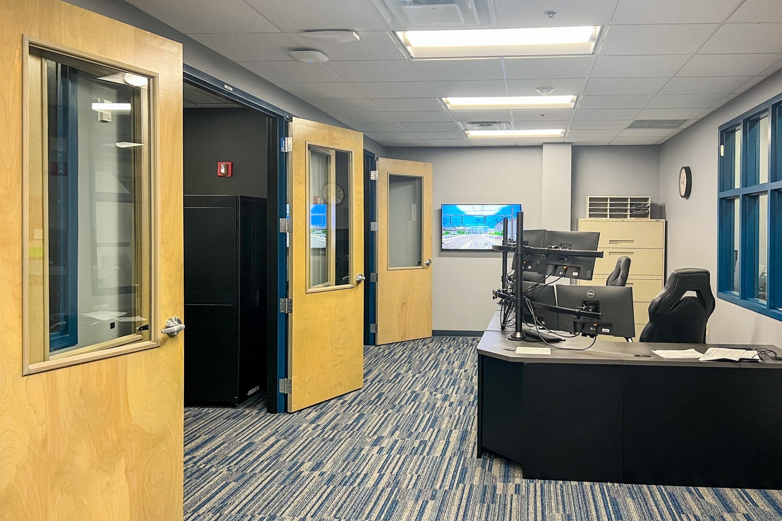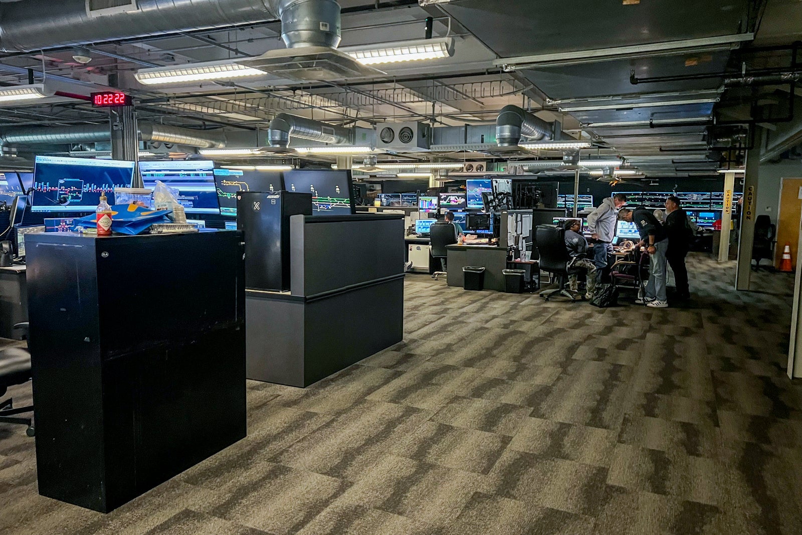 Unlike the CNOC area, the CETC section is very dark, with little natural light. However, the lack of light makes it easier to see the important monitors and maps the CETC team keeps a close eye on. Massive screens show the railroad tracks and if they are clear of trains or if trains are about to enter various parts of the system.
