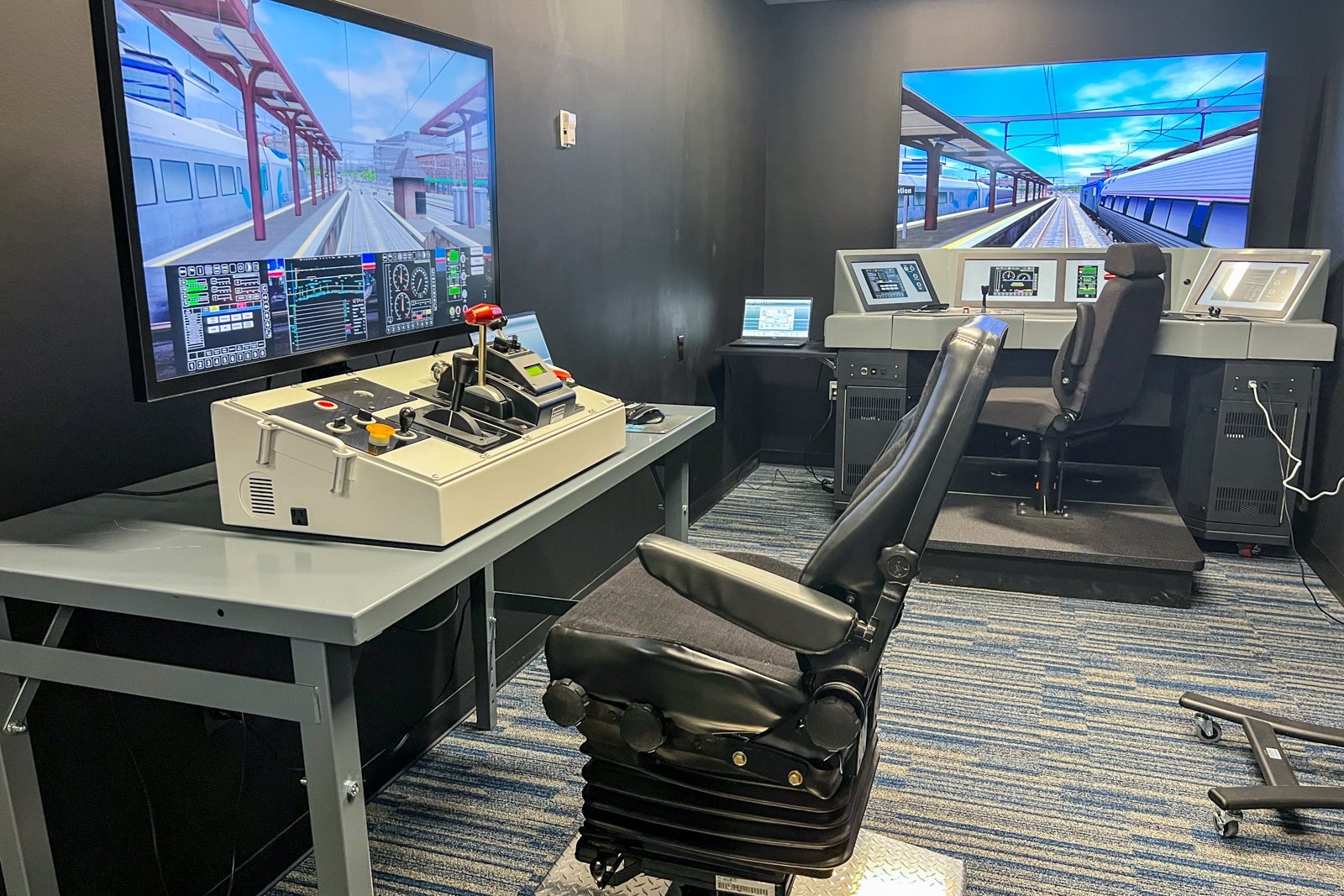 In addition to the simulators, students interact with model trains, plus full-size tracks and even large train car models.