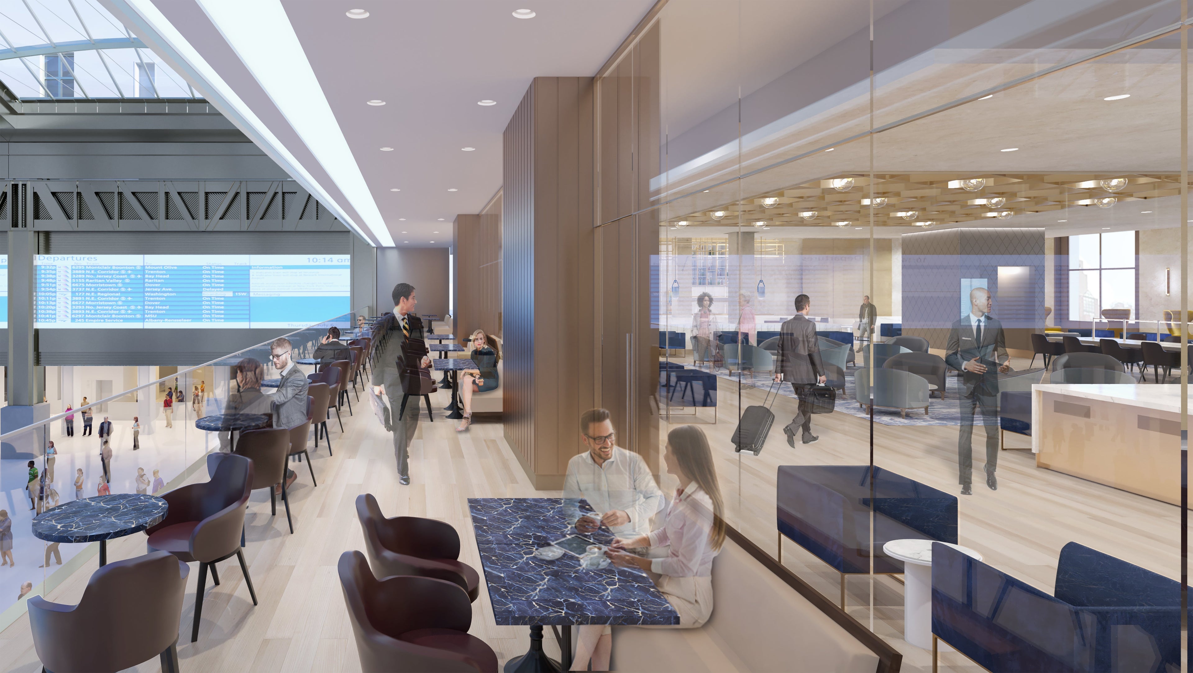With this renovation, the train operator has released renderings of the its new lounge, called the Metropolitan Lounge (formerly ClubAcela) that will be located in Moynihan Hall. It will be replacing the current Club Acela, which lacks windows and features sparse amenities and food offerings.