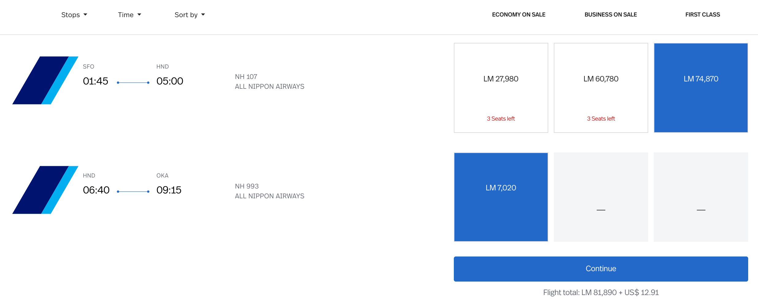 Remember too that Avianca LifeMiles might be the best option if you're looking to book a mixed-cabin itinerary — like this one from San Francisco to Okinawa (OKA):