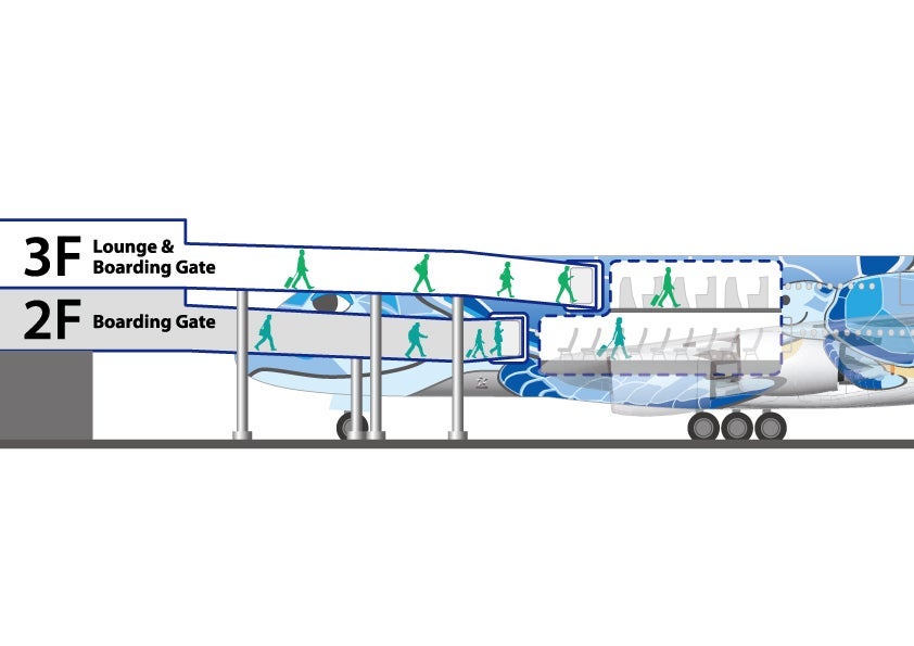 The lounge will be located above what's currently known as Gate 29 in the main terminal, but which will be renamed to Gate C4 in Honolulu's new Terminal 2. For premium-class passengers, the most exciting feature will be the ability to board directly from the first-class ANA Suite lounge onto the upper deck of the A380, completely bypassing the common herd at the boarding gate one floor below, as seen in this diagram: