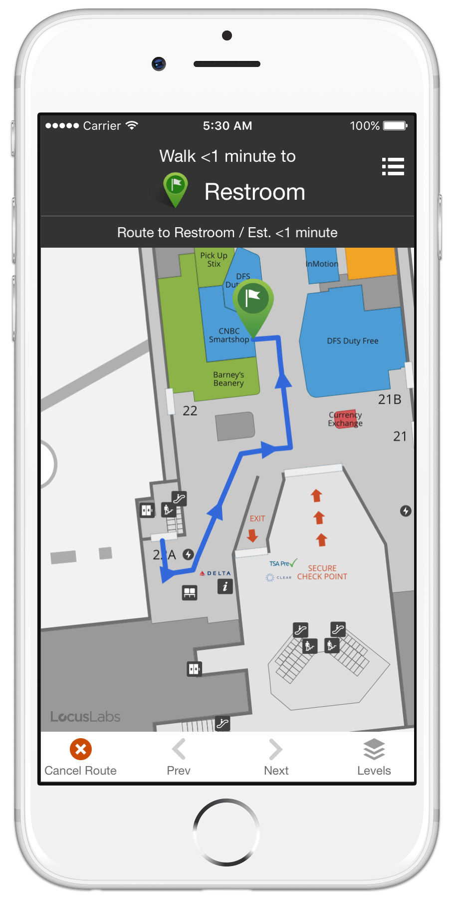 If you're making a tight connection, you'll even be able to see the fastest route and how long it takes to walk from gate to gate. And when you're hungry, the app feature can point you toward eateries in the terminal. Upon launch, travelers will have access to interactive maps in nearly 50 airports across the world.