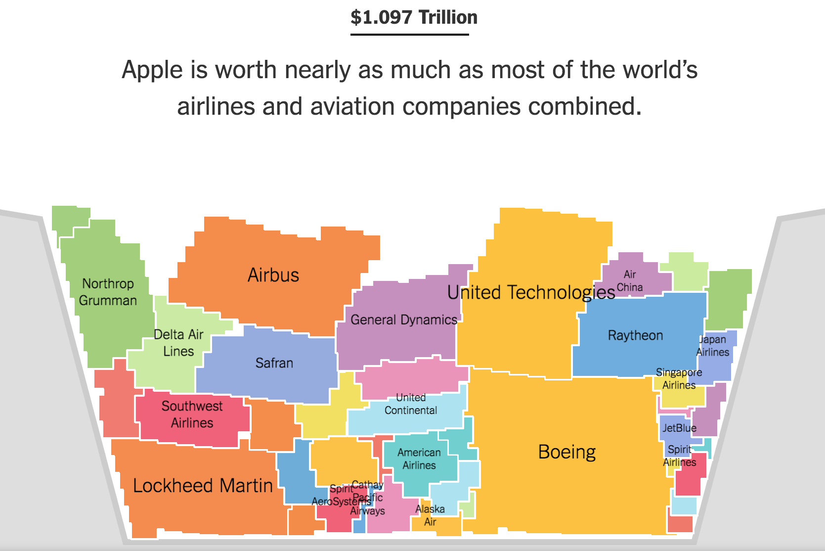There was a surprising tidbit in there — Apple is worth almost as much as all of the world's major airlines and aviation companies combined. The combined value of all these companies, including massive aircraft manufacturers like Airbus, Boeing, Lockheed Martin, Northrop Grumman and major airlines like American, United, Delta, Alaska, Air China, Singapore and Southwest (the list goes on on) is about $1.01 trillion.