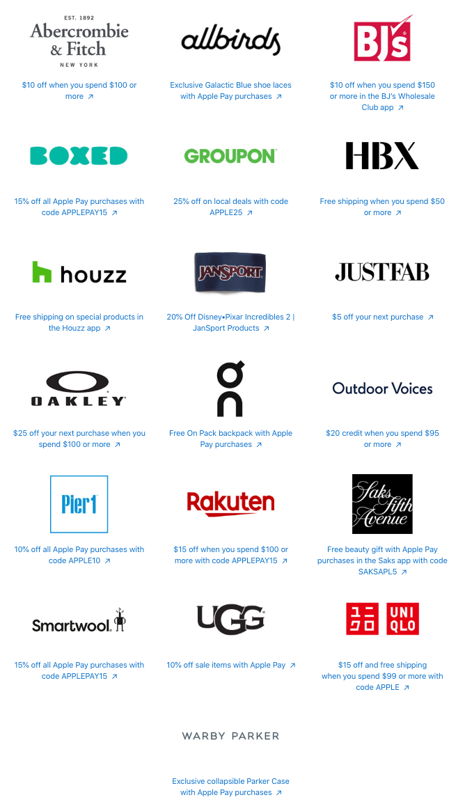 From December 6th through the 19th, the retailers listed below will offer discounts when using Apple Pay and/or select discount codes: