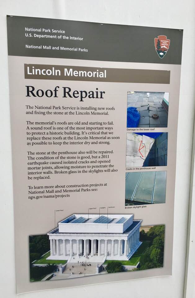 The 2011 earthquake did damage to the roof and the skylights. Currently, repairs are being made to both. The expected roof completion date is still many months out. An awesome perk of the renovations is a larger plan to provide visitors the ability to access the open portion beneath the chamber where Lincoln sits. One of the National Park Rangers said that the plan is to build an enclosed walkway in the base of the memorial so that you will be able to walk from one end of the base to the other. This new construction project will take an additional couple of years to complete.