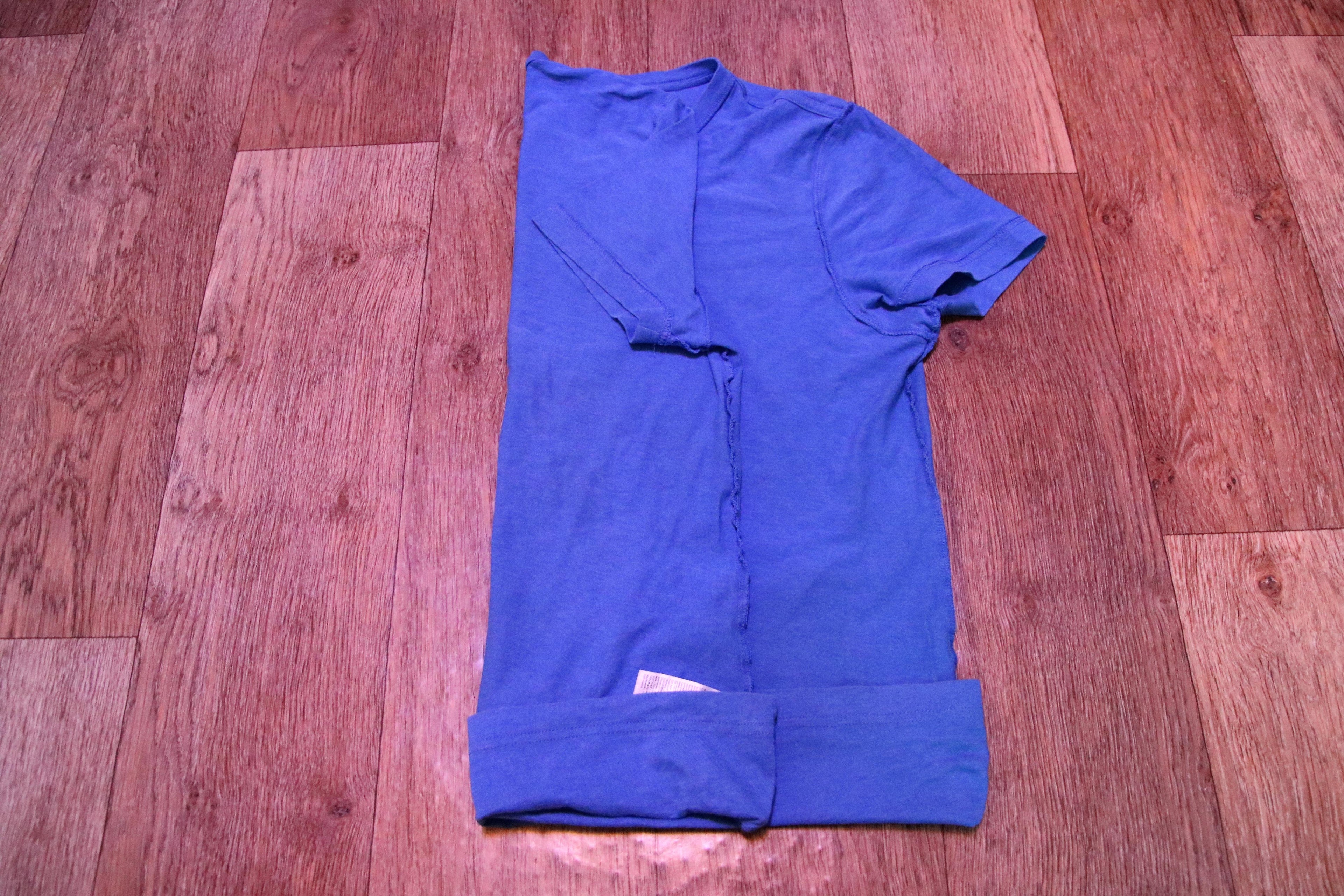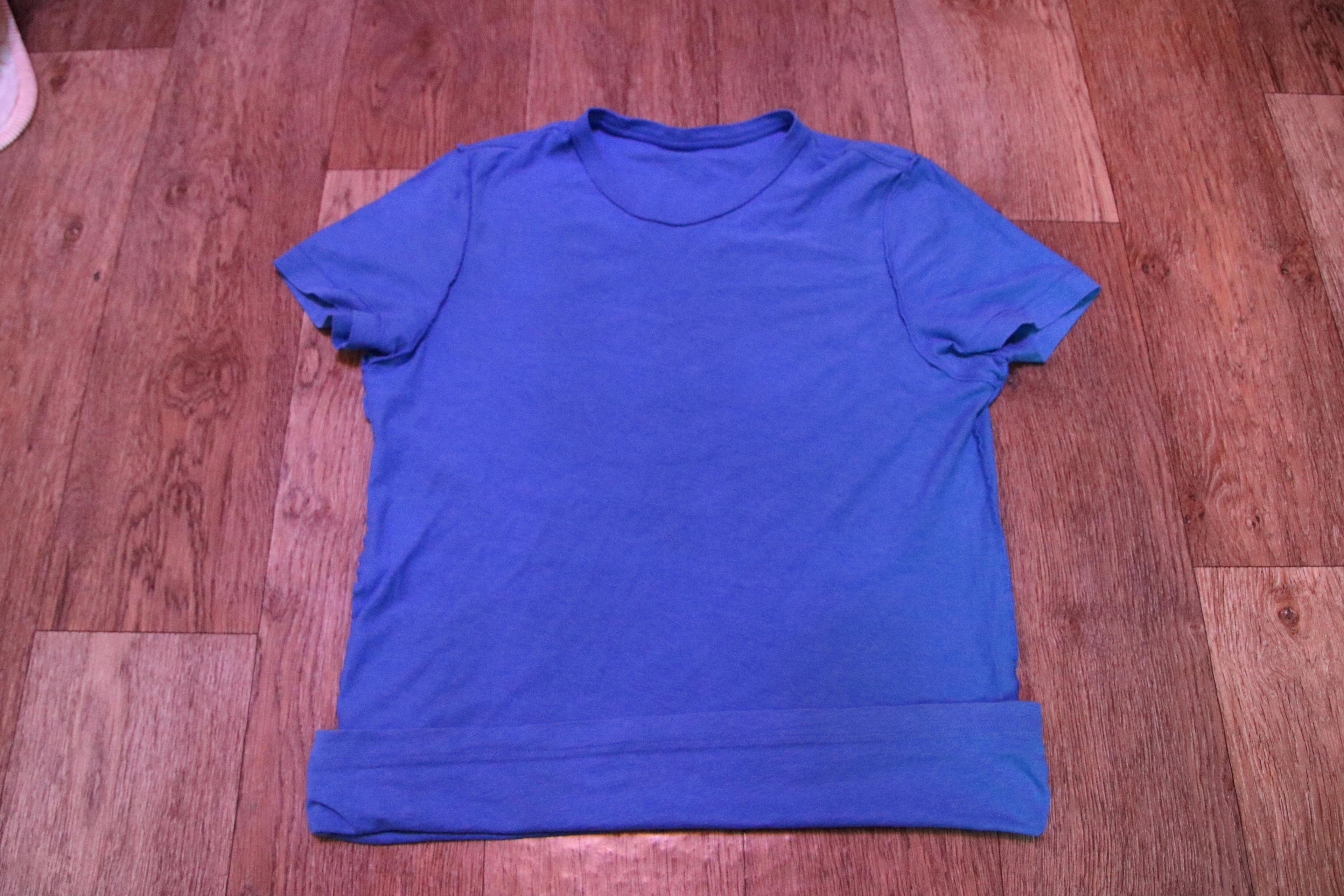 1. Lay the T-shirt flat, and flip the bottom up two or three inches inside out, smoothing it over the shirt as shown below.