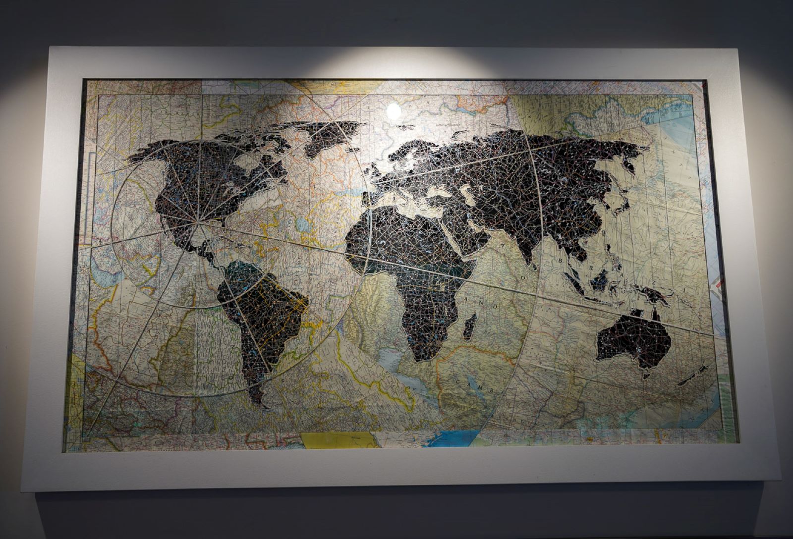 Our tour began in Terminal C, which features 34 works of art by Houston artists acquired and installed in 2019 thanks to a partnership with United Airlines. Stop one was at a piece titled World Map, Houston Nexus, by Nick Vaughan and Jake Margolin.