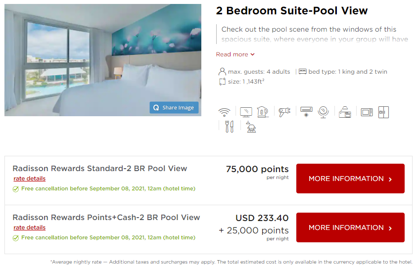 The two-bedroom units are 1,143 square feet and can be booked with cash, points, or a combination of points and cash. During the dates of my trip, I could book one of these rooms for 75,000 Radisson Rewards points per night, or $233.40 and 25,000 points. With cash rates available for less than $300 a night and Radisson points worth 0.4 cents each based on TPG valuations, it didn't make sense to book a points and cash reservation, though. That's why I opted to use points in the end, but not for one of these rooms.