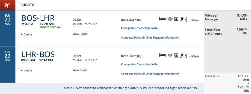 Boston (BOS) to London Heathrow (LHR) round-trip for 107,000 SkyMiles + $266.56 in Delta One in November: