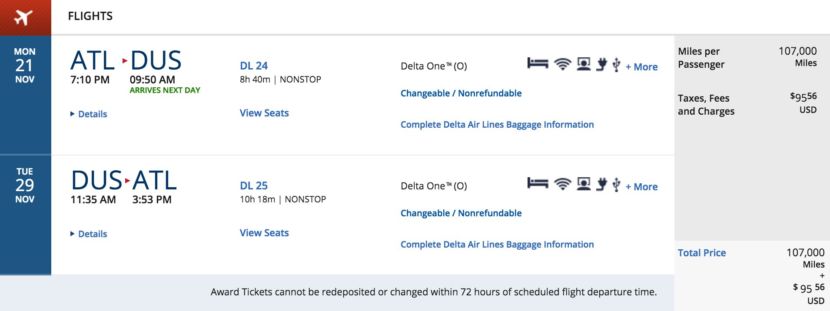 You can fly between Atlanta (ATL) and Dusseldorf (DUS) round-trip for 107,000 SkyMiles plus taxes & fees. The award redemption drops to 49,000 SkyMiles plus taxes & fees for Main Cabin.