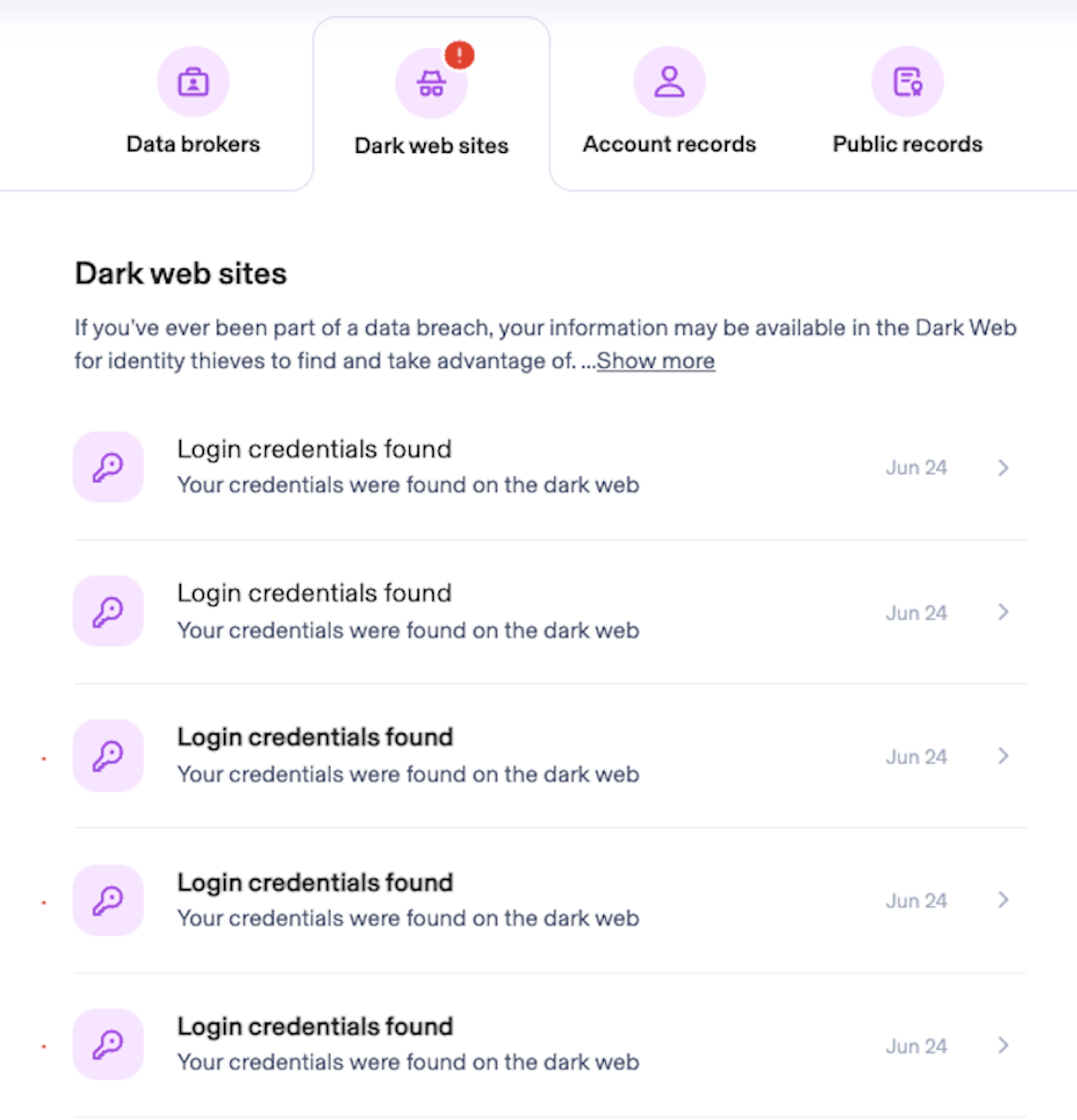 I also received alerts that my information was found on several dark web sites. I was able to click on each and read details about the exposure — including recommended actions to take and points of contact available for some of them. Several of these were related to past incidents, such as the Equifax breach in 2017. I had already taken recommended steps like freezing my credit and changing my passwords since then, but it's important to read each alert to see if you need to take any action.