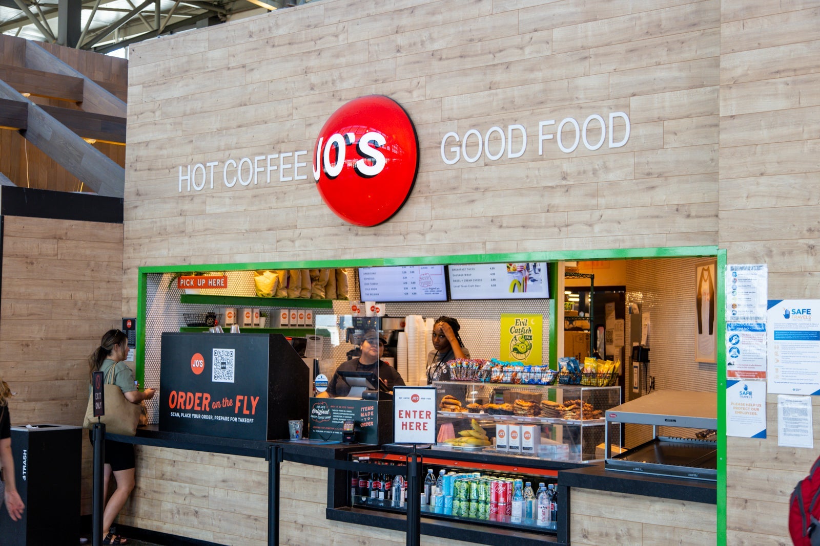 You can also head to Jo's Coffee near the terminal entrance. The space looks like an outdoor dining area, complete with an Austin-style food truck. You'll find coffee, breakfast tacos and pastries, and a to-go coffee stand where you can fill up a cup of coffee, pay with a QR code and be on your way in seconds.