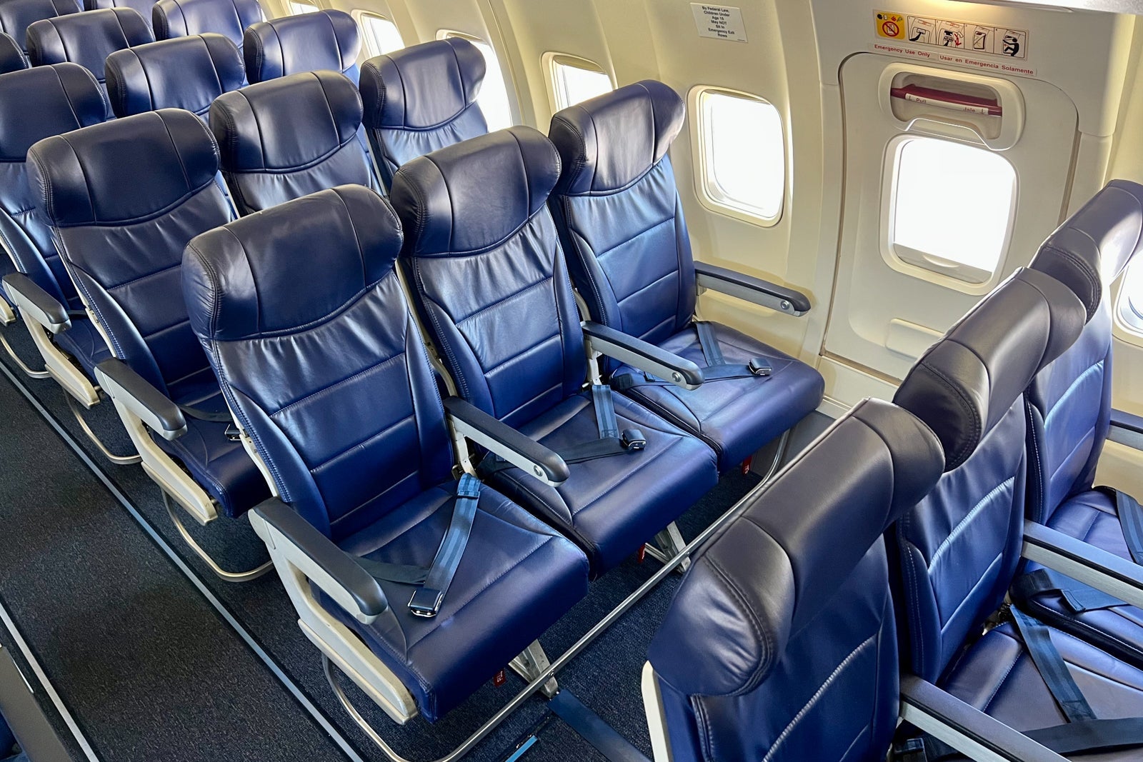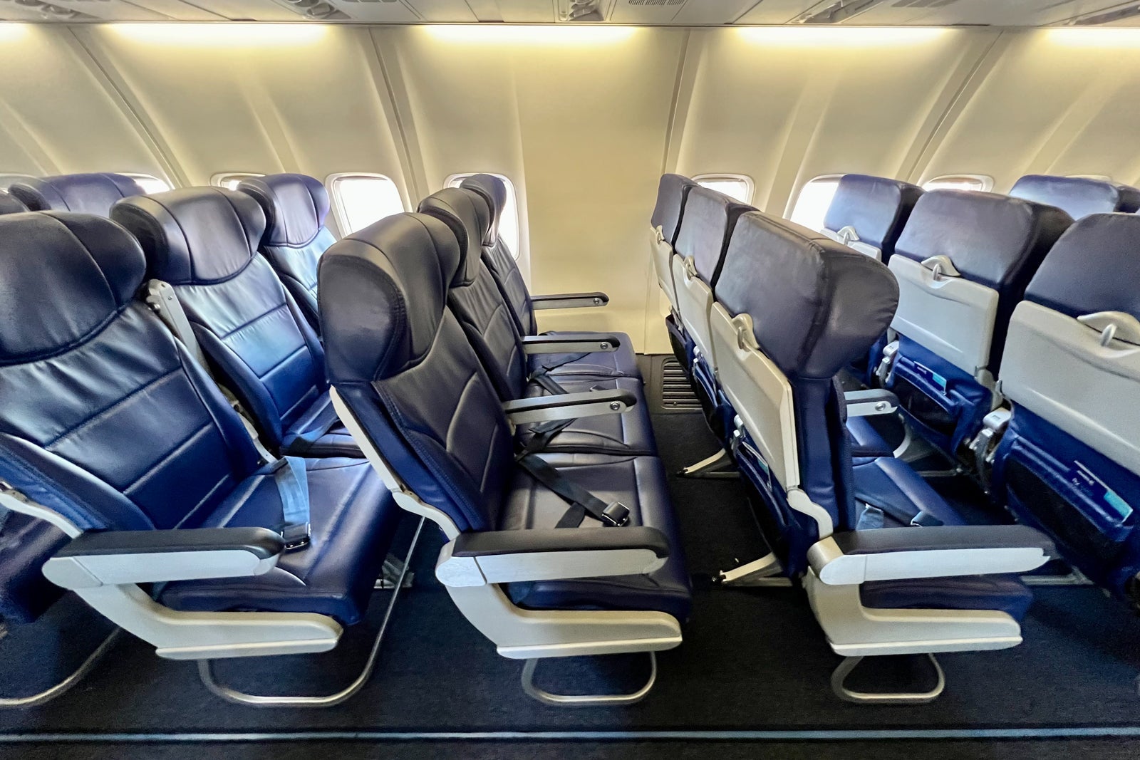 Once inside, Avelo's orange and purple branding quickly faded, giving way to a familiar site for many Southwest Airlines flyers: 25 rows of blue leather seats arranged in a 3-3 configuration. The only thing missing was the Southwest branding: you won't find any heart decals on either of the bulkhead walls.