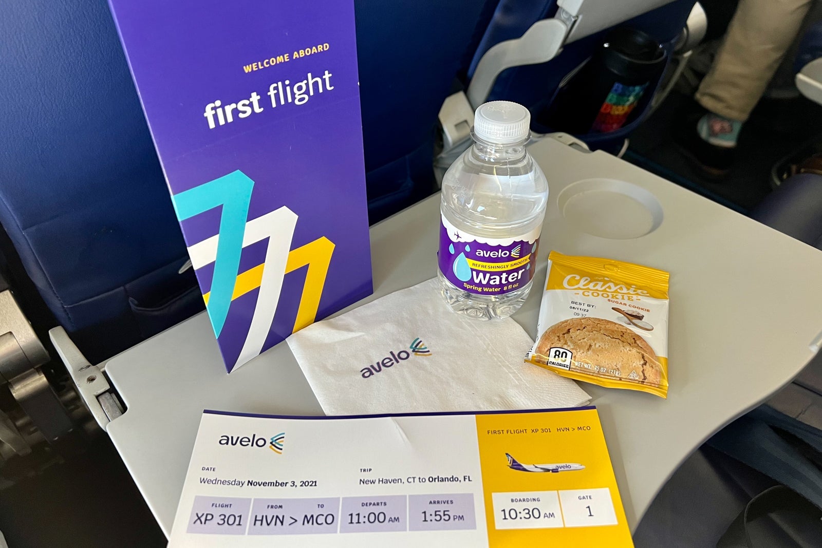 Flight attendants began their service once we crossed through 10,000 feet. They offered an 8-ounce bottle of Avelo-branded water and an 80-calorie sugar cookie to each passenger. (Avelo plans to transition to a buy-on-board model once the pandemic subsides.)
