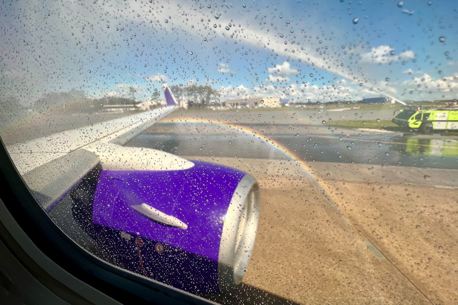 Moments later, two firetrucks approached the plane and gave us a traditional water cannon salute to mark the inaugural flight. All the aviation enthusiasts aboard were peeled to the windows, and some even caught a glimpse of the fleeting rainbow that appeared on the port side of the jet.