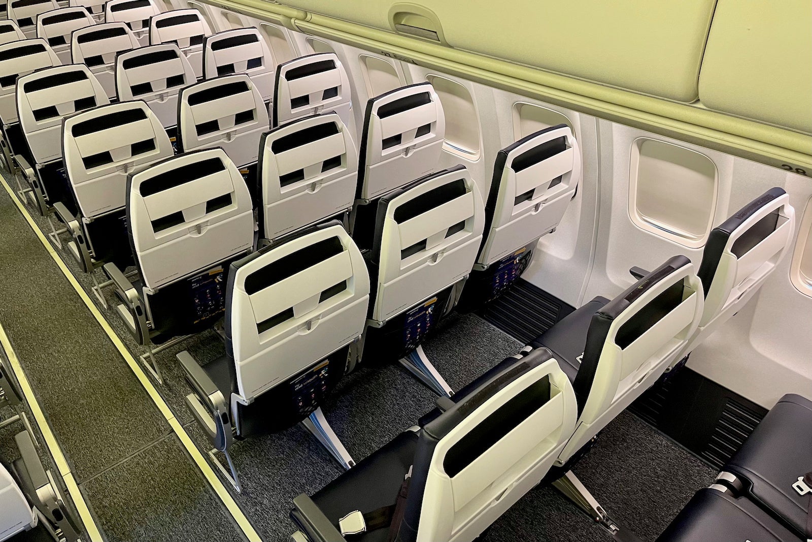 Avelo's 737s are outfitted with 189 seats in an all-coach configuration. Seats are spread across in a 3-3 layout, with 60 extra-legroom ones in the pointy end of the plane.