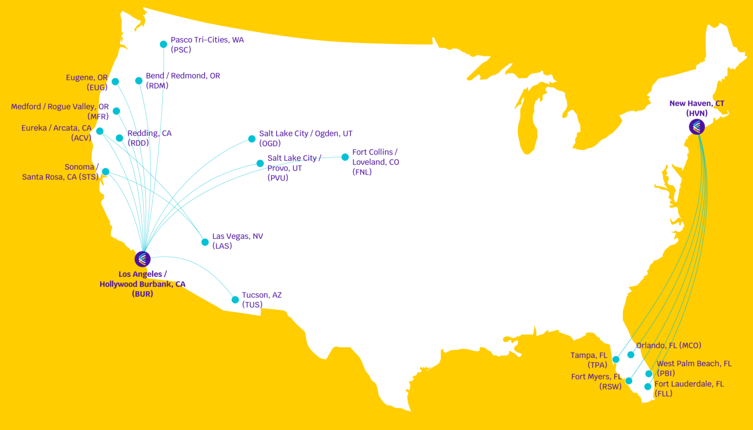 Next up for Avelo, however, will be its debut of service on the East Coast, which begins Nov. 3. There, the airline has been exclusively in growth mode. Avelo unveiled four routes to popular Florida cities from its new base in New Haven, Connecticut (HVN) in August, and later added a fifth route from the Tweed-New Haven Airport to West Palm Beach (PBI).