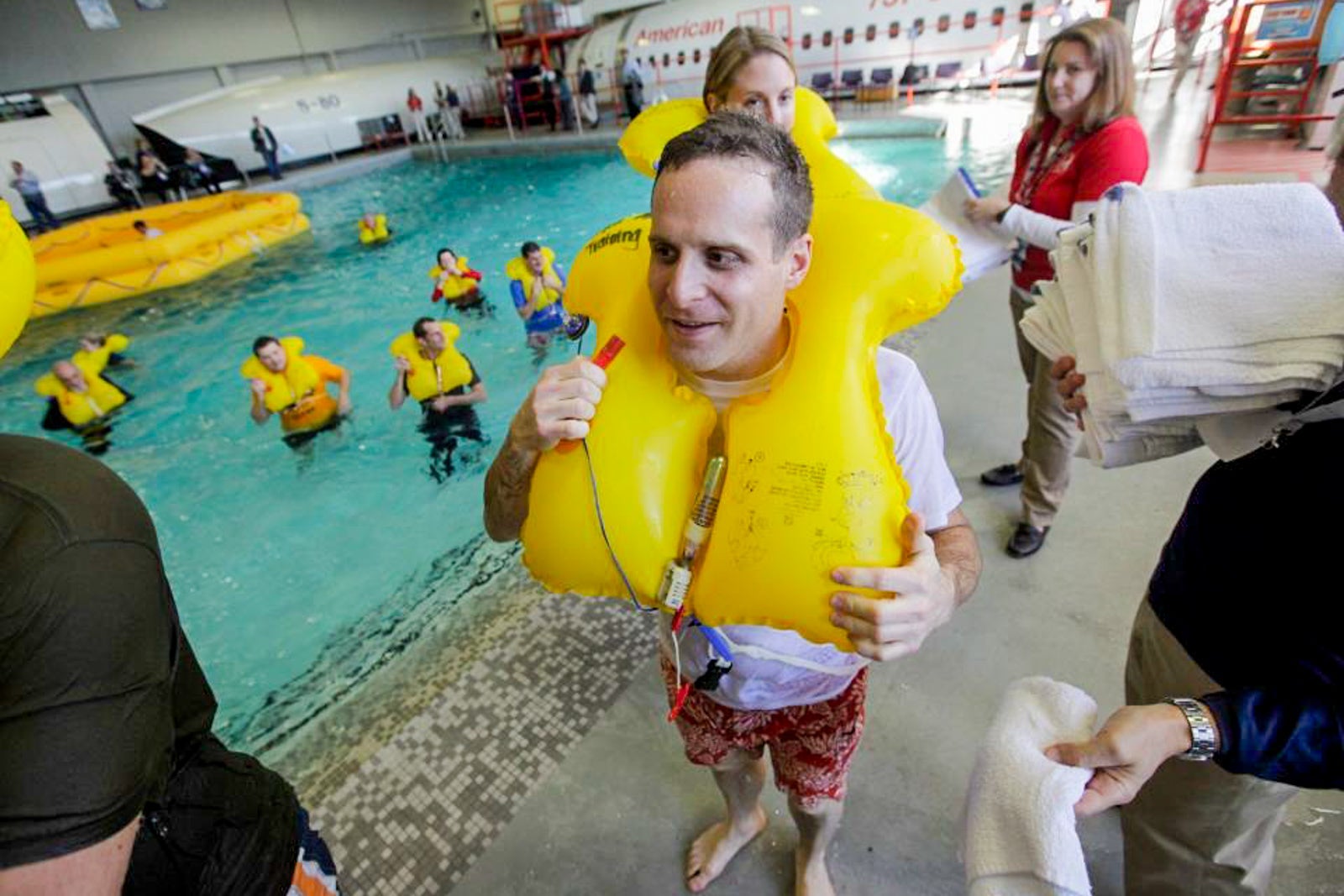 There are lessons on opening and closing doors and how to evacuate a plane during a land or water landing.