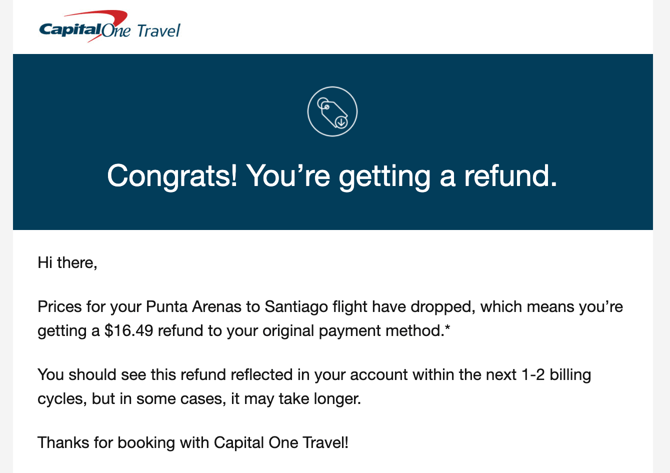 That's what happened to TPG reporter Chris Dong, who booked a domestic flight within Chile. The Capital One algorithm encouraged him to book now. A couple of days later, he received an email from Capital One with the subject line, "Good news! You're getting a refund."
