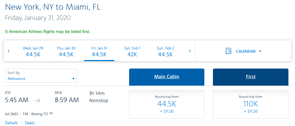 The cheapest round-trip itineraries to Miami I saw on Super Bowl weekend are from the New York City area. American has nonstop itineraries from JFK for $327 round-trip for basic economy tickets. This is rather surprising because award tickets prices are 44,500 American miles. In this case, you'd want to use cash or fixed-value points.