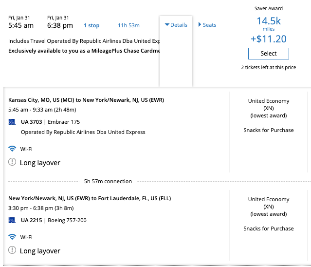 I'll just start with a blanket statement: If you want convenient, nonstop flights to Miami for Super Bowl weekend, at this point you'll be paying absurd award or revenue costs. No legacy airline in the U.S. has a standard award chart, so there is no saver space left to South Florida. You may still find some cheaper award flights, but from the searches I ran, they'll have long layovers on ill-timed flights. If you're a Chiefs fan, you can fly Kansas City to Miami for 14,500 United miles on Friday, Feb. 3, but you'll go by way of Newark starting at 5:45 a.m. and have a six-hour layover: