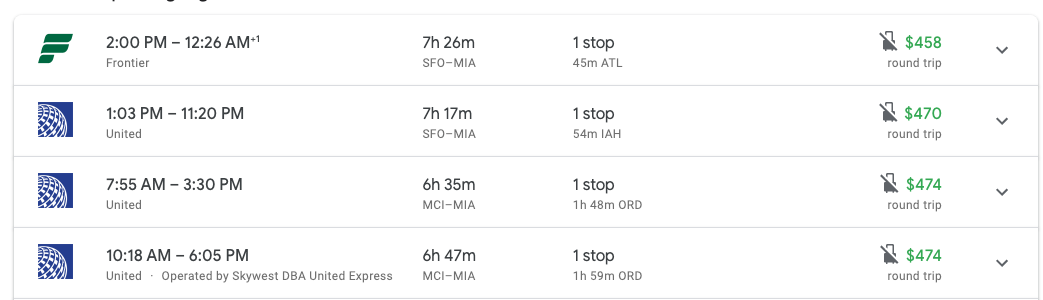 For revenue flights, if you're a fan heading from either Kansas City or San Francisco for the game, flight prices into Miami on Friday and returning Monday are hovering between $460 and $700 for round-trip economy tickets. That $460 is actually less than I was expecting, but those United itineraries do require a connection.