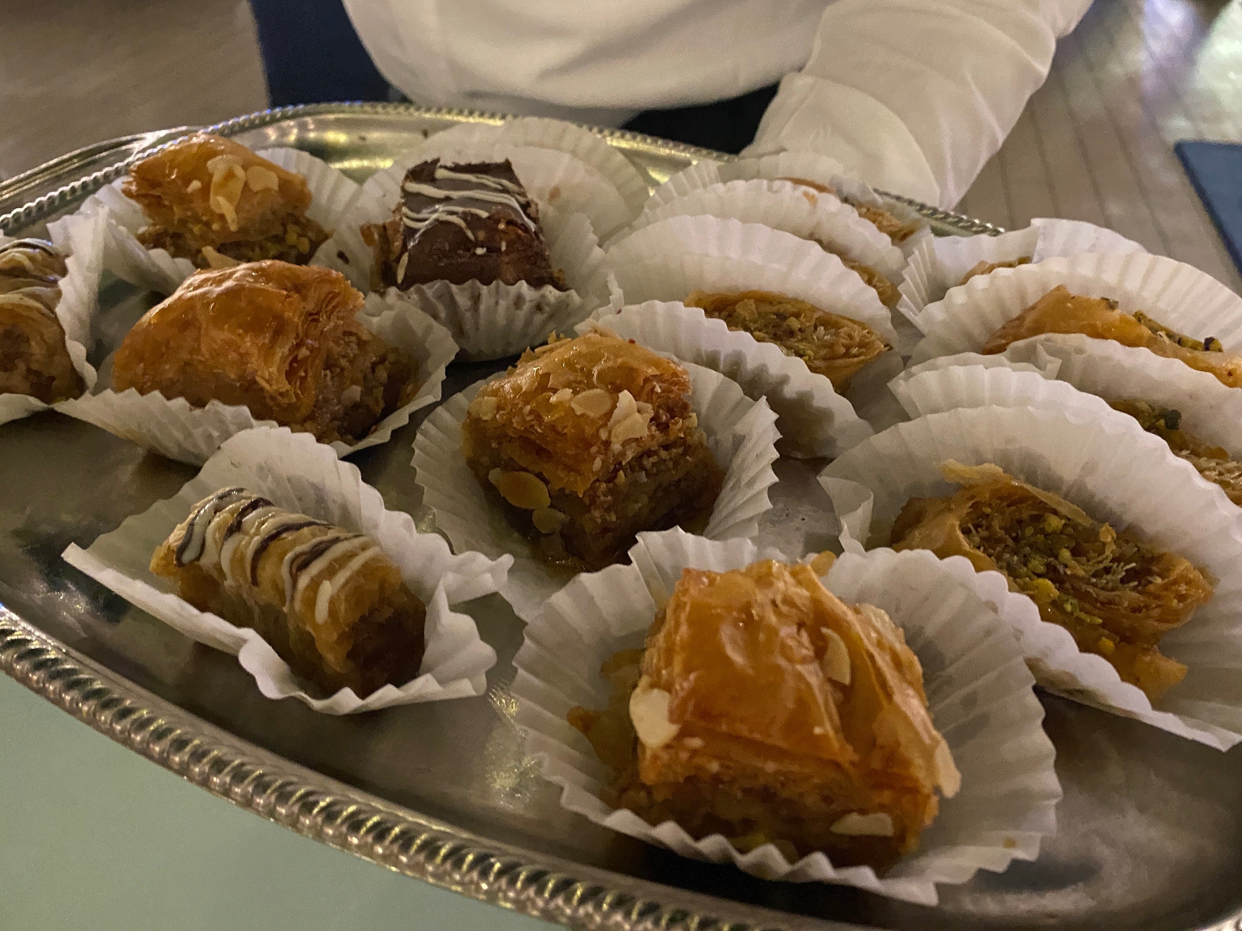 In its entirety, the celebration lasted 75 minutes. The performance was wonderful, and the baklava was tasty, but the wind was so strong that unused chairs set up for the show were blowing across the decks, along with stray napkins.