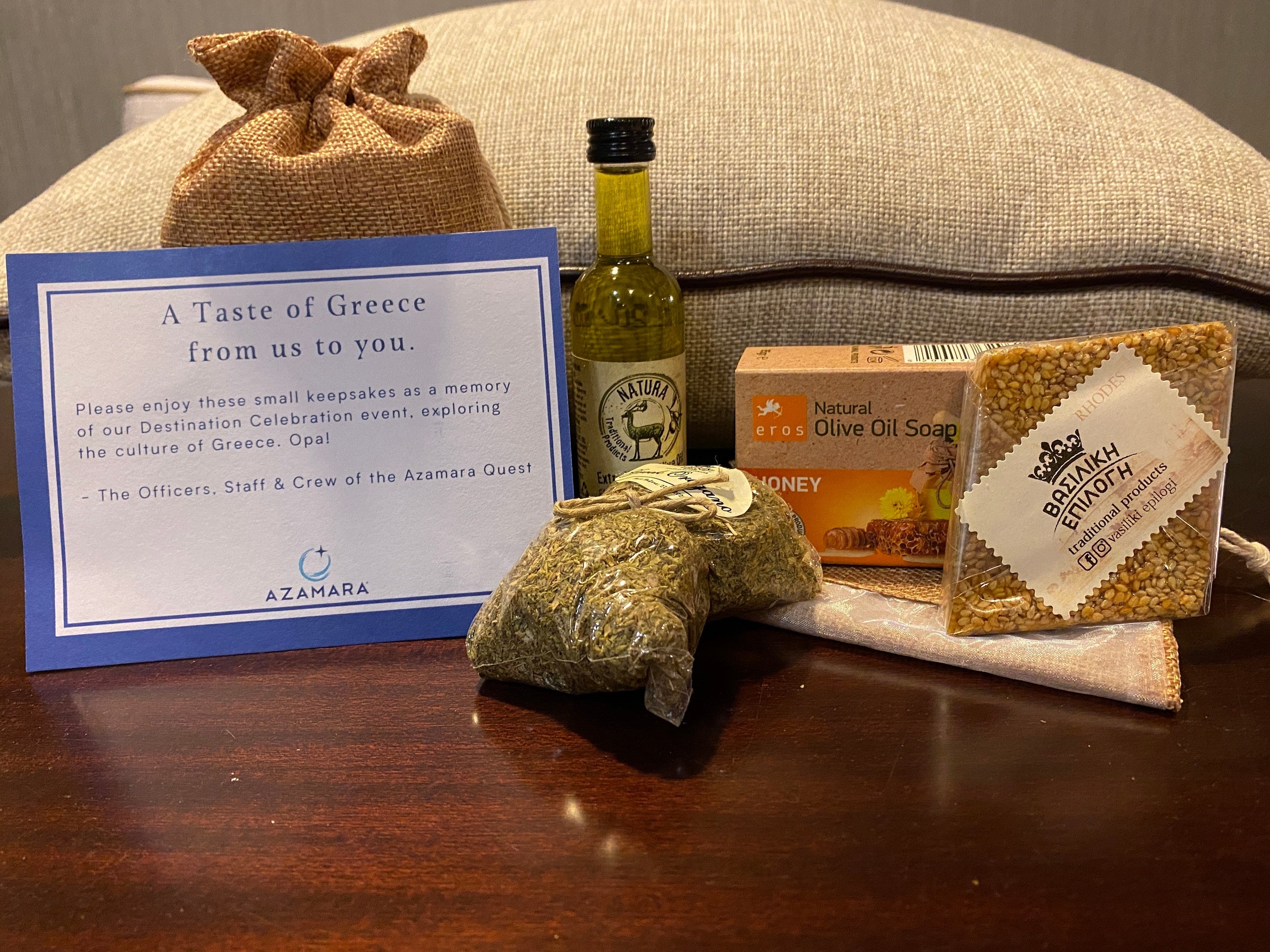 When I returned to my cabin, I had a small bag of Greek-themed goodies -- olive oil soap, olive oil, oregano, and candy -- waiting for me, which was a nice touch.