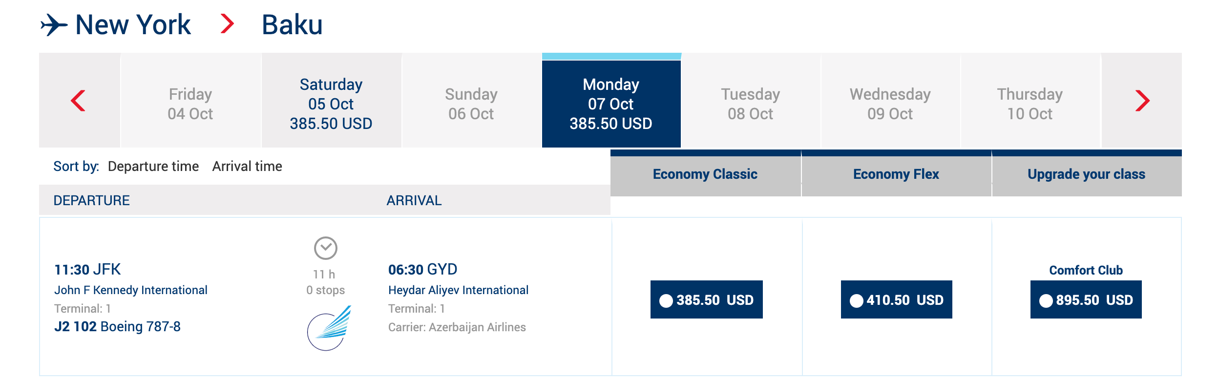 The route, which runs Mondays and Saturdays to the capital of Azerbaijan, will effectively be uninterrupted despite the airline's earlier announcement that it would halt its US service. The last flight was supposed to run on Sept. 30, and the newly bookable flights that begin Oct. 5 represent an extension of the previous schedule. The carrier's JFK flight remains the only Azerbaijan Airlines route to America.