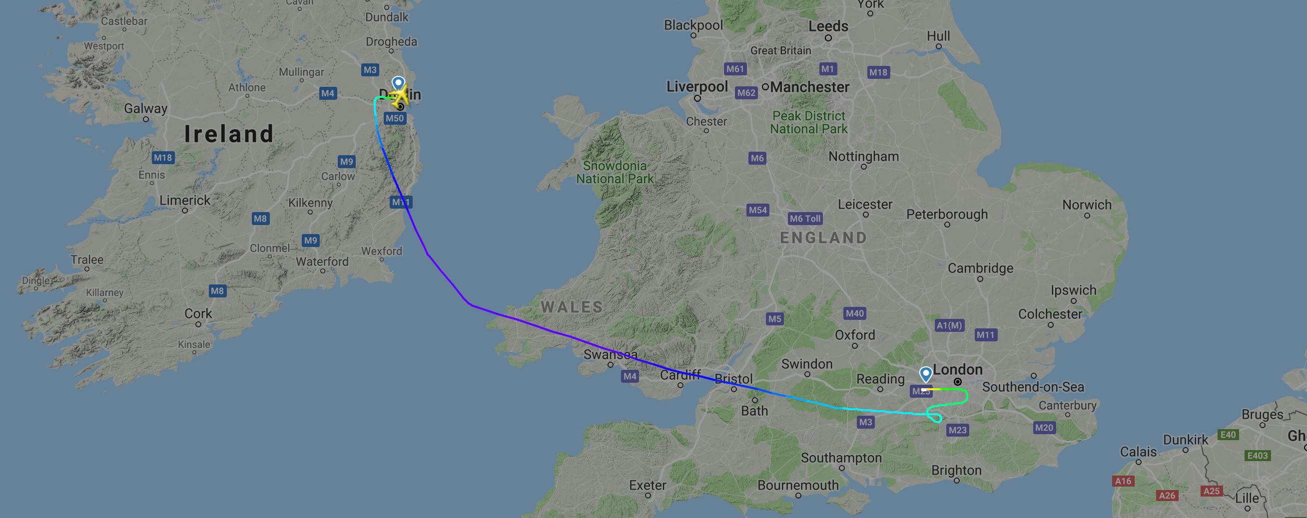 No passengers were on board the one-hour, seven-minute flight. While the 20-year-old aircraft left a sunny Dublin, it was welcomed to London with rain.