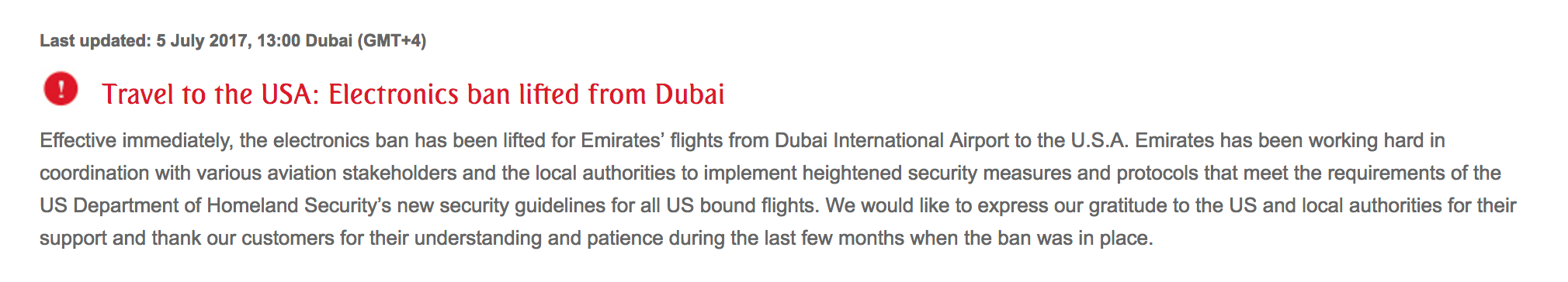 This is good news for passengers who are traveling between DXB and IST and the US. The carriers for which the electronics ban still applies include EgyptAir, Kuwait, Qatar, Royal Air Maroc, Royal Jordanian and Saudia. However, according to Reuters, Saudia expects to lift its electronics ban on nonstop flights to the US by July 19.