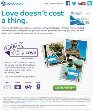 Barclaycard announced the launch of their first social network driven campaign, #LiketoLove, on Facebook with daily and weekly prizes as well as a grand prize of up to $25,000 now through September 8, 2013.