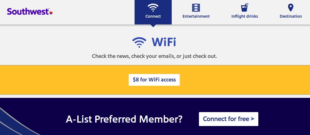 Southwest offers Wi-Fi at a very reasonable $8 a day and its Wi-Fi is much more reliable than it used to be. If you fly out of Baltimore in the morning for a work trip to Boston and fly home in the afternoon, you won't have to pay for Wi-Fi again. Plus there's free access to text messages via iMessenger or WhatsApp.