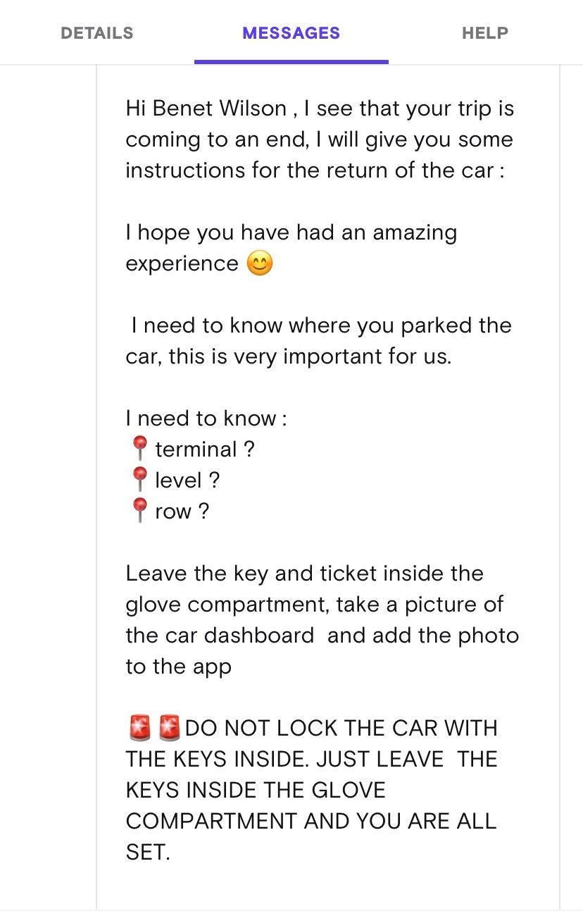 The process to return the car was easy, too. I parked the car in the same area, took 10 photos of the car inside and out, uploaded them to the app, put the key and parking ticket in the glove compartment, sent a message to the owner explaining where the car was located, left it unlocked as instructed and walked to the terminal, again avoiding a wait at the rental car return desk.